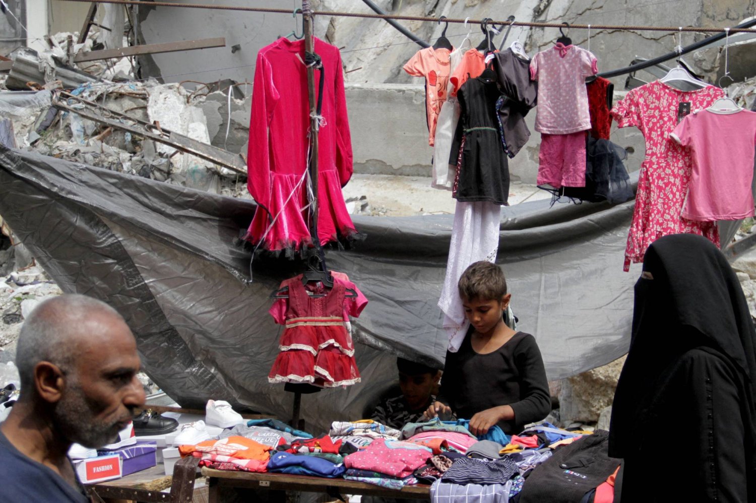 ويتوافد النازحون في القطاع على أسواق مدينة رفح لشراء مستلزمات العيد من ملابس وحلويات لاستقبال عيد الفطر.