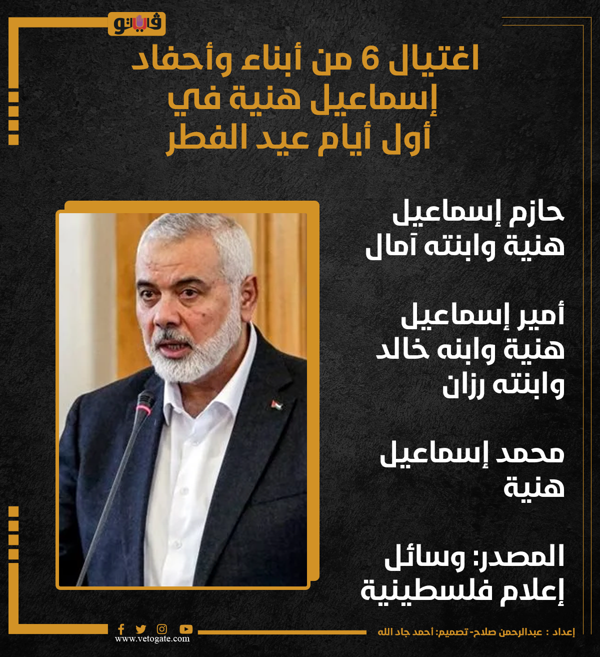 اغتيال 6 من أبناء وأحفاد إسماعيل هنية في أول أيام عيد الفطر (إنفوجراف) الأربعاء 10/أبريل/2024 - 09:45 م 4/10/2024 9:45:40 PM هنية، فيتو عبدالرحمن صلاح شارك طباعة 18 حجم الخط شارك طباعة أبناء إسماعيل هنية أحفاد إسماعيل هنية إسماعيل هنية حركة حماس غزة قطاع غزة