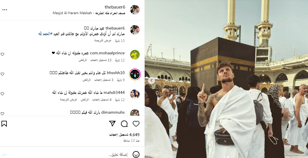 العمرة، أدى الألماني روبرت باور، لاعب الطائي السعودي، مناسك العمرة للمرة الأولى في حياته، بعد اعتناقه الإسلام.
