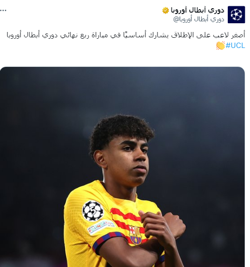 دوري أبطال أوروبا، سلط الحساب الرسمي لبطولة دوري أبطال أوروبا الضوء على إنجاز لامين يامال في تاريخ دوري أبطال أوروبا.