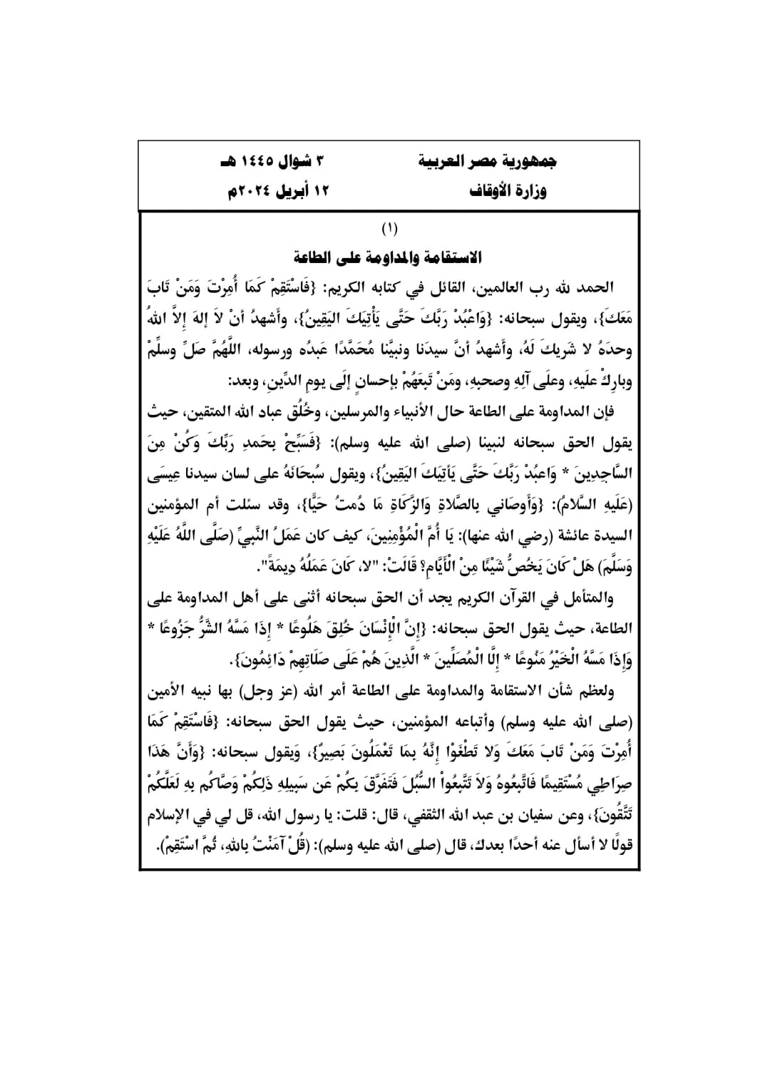 حددت وزارة الأوقاف موضوع خطبة اليوم الجمعة تحت عنوان “الاستقامة والمداومة على الطاعة”.