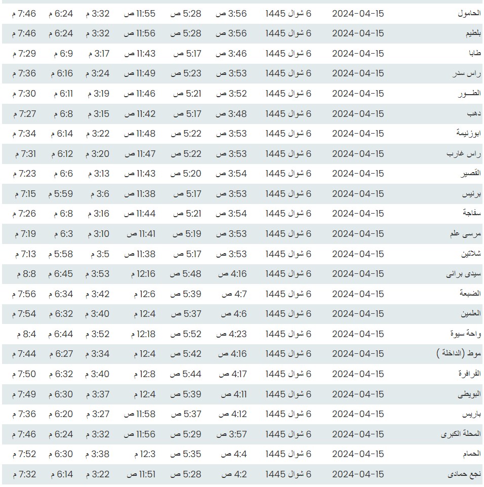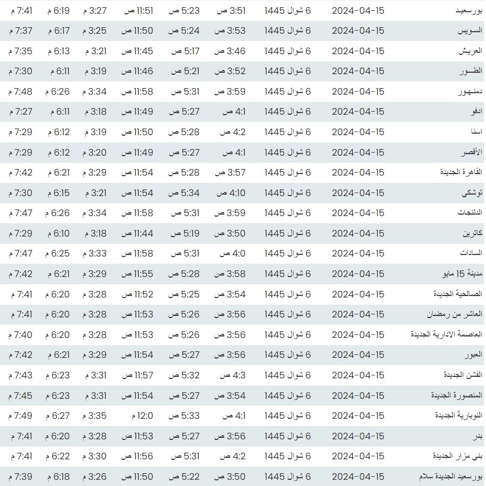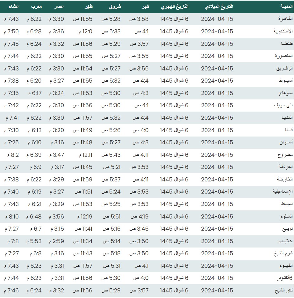 وفيما يلي مواقيت الصلاة، لعدد من مدن ومحافظات الجمهورية من واقع بيانات الهيئة العامة للمساحة
