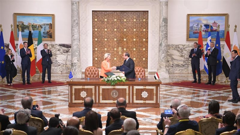 - وقع الرئيس عبد الفتاح السيسي ورئيسة المفوضية الأوروبية على الإعلان المشترك " اتفاق الشراكة الاستراتيجية " حيث تغطي الشراكة الاستراتيجية إجمالي ستة ركائز تتعلق بالعلاقات السياسية والاستقرار الاقتصادي والتجارة والاستثمار والهجرة والتنقل والأمن والديموغرافيا ورأس المال البشري فضلا عن التوقيع على اتفاقية تعاون كبيرة بين الحكومة المصرية والاتحاد الأوروبي وسلسلة من الاتفاقيات في قطاع الصحة ودعم المؤسسات الصغيرة والمتوسطة والاستثمار.