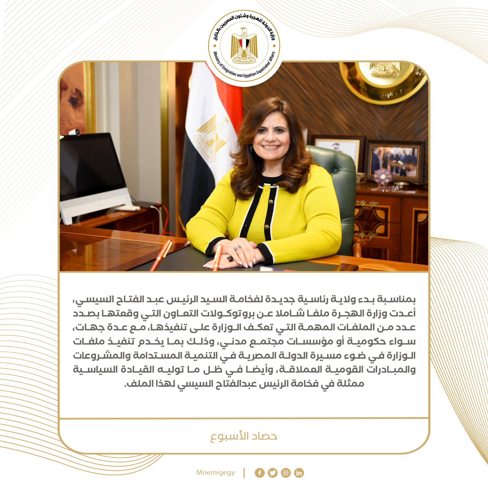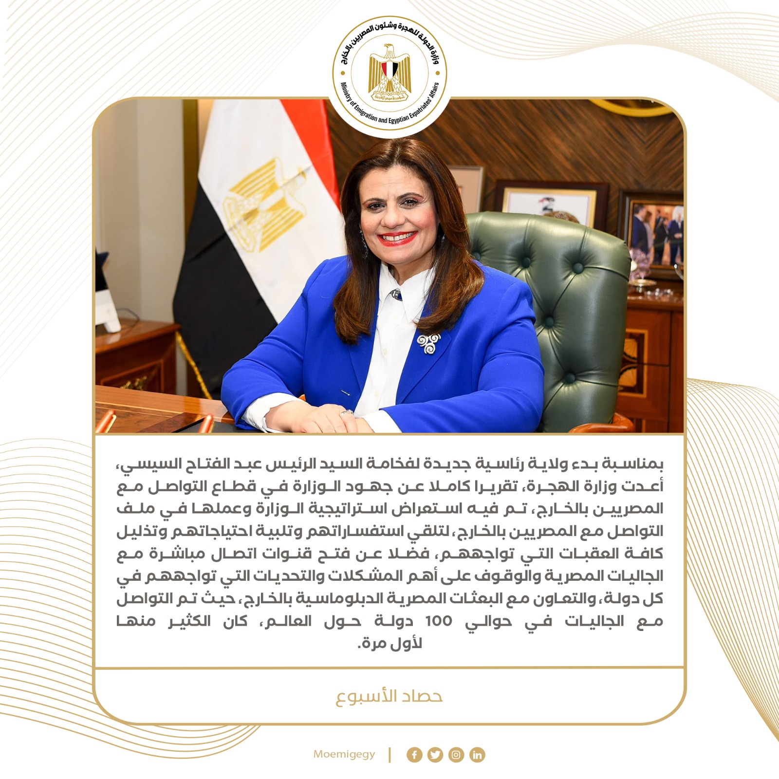وبمناسبة بدء ولاية رئاسية جديدة الرئيس عبد الفتاح السيسي، أعدت وزارة الهجرة، تقريرا كاملا عن جهود الوزارة في قطاع التواصل مع المصريين بالخارج، تم فيه استعراض استراتيجية الوزارة وعملها في ملف التواصل مع المصريين بالخارج، لتلقي استفساراتهم وتلبية احتياجاتهم وتذليل كافة العقبات التي تواجههم، فضلا عن فتح قنوات اتصال مباشرة مع الجاليات المصرية والوقوف على أهم المشكلات والتحديات التي تواجههم في كل دولة، والتعاون مع البعثات المصرية الدبلوماسية بالخارج، حيث تم التواصل مع الجاليات في حوالي ١٠٠ دولة حول العالم، كان الكثير منها لأول مرة.