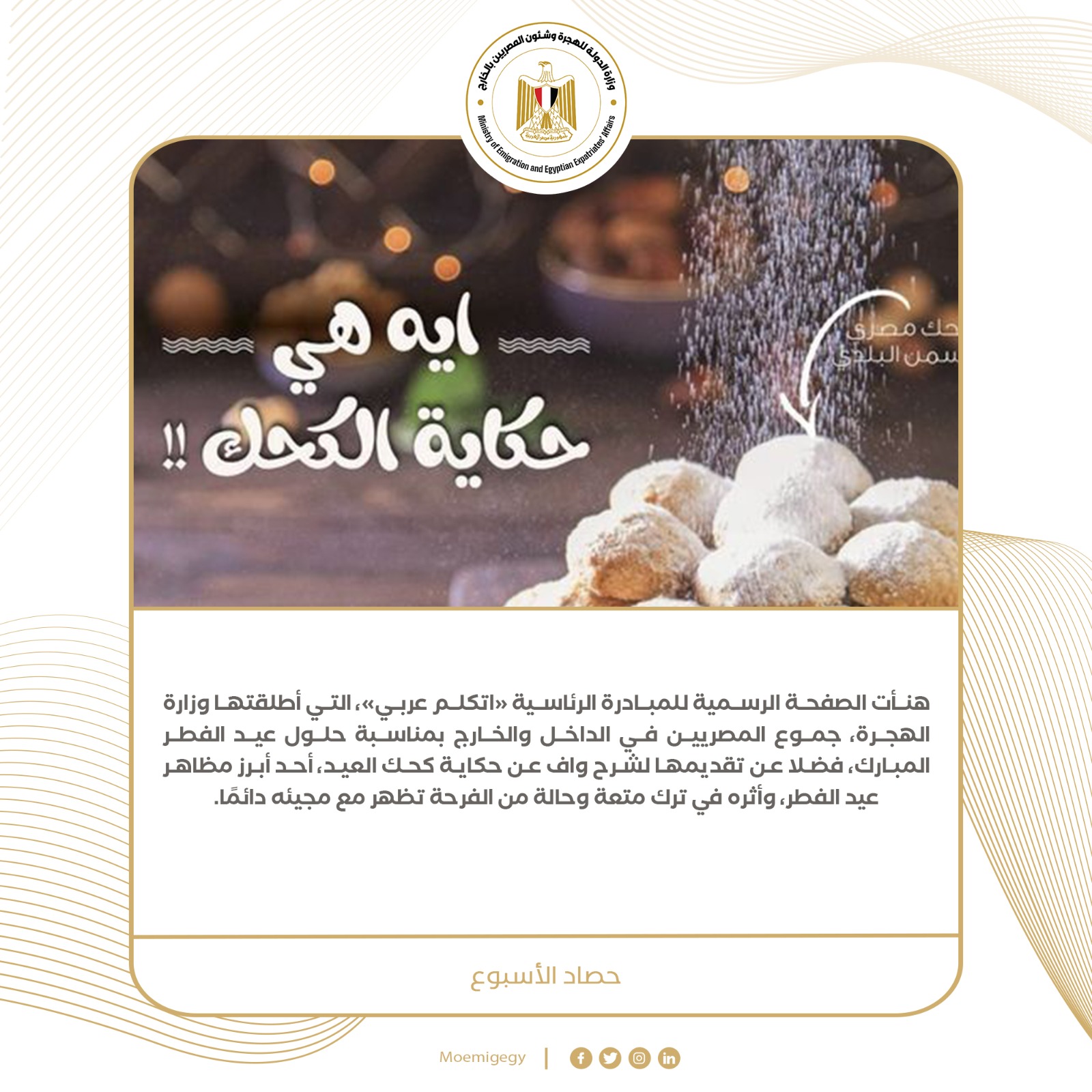 وهنأت الصفحة الرسمية للمبادرة الرئاسية «اتكلم عربي»، التي أطلقتها وزارة الهجرة، جموع المصريين في الداخل والخارج بمناسبة حلول عيد الفطر المبارك، فضلا عن تقديمها لشرح واف عن حكاية كحك العيد، أحد أبرز مظاهر عيد الفطر، وأثره في ترك متعة وحالة من الفرحة تظهر مع مجيئه دائمًا.