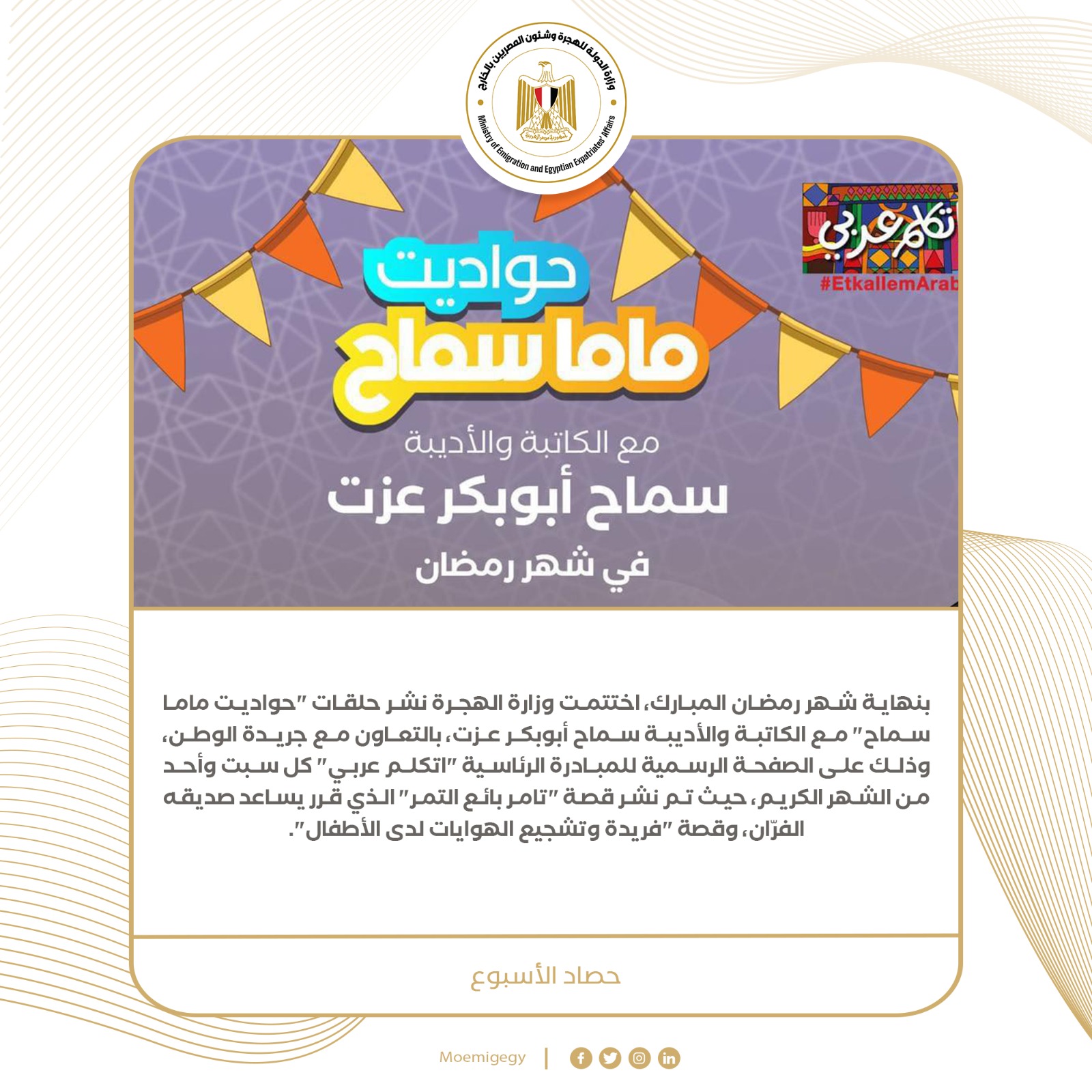 وبنهاية شهر رمضان المبارك، اختتمت وزارة الهجرة نشر حلقات "حواديت ماما سماح" مع الكاتبة والأديبة سماح أبوبكر عزت، بالتعاون مع جريدة الوطن، وذلك على الصفحة الرسمية للمبادرة الرئاسية "اتكلم عربي" كل سبت وأحد من الشهر الكريم، حيث تم نشر قصة "تامر بائع التمر" الذي قرر يساعد صديقه الفرّان، وقصة "فريدة وتشجيع الهوايات لدى الأطفال".