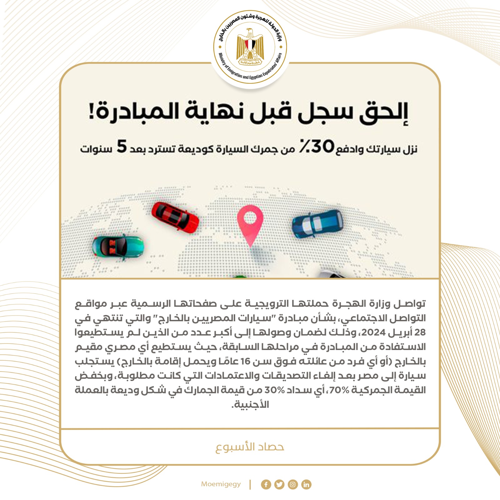 و تواصل وزارة الهجرة حملتها الترويجية على صفحاتها الرسمية عبر مواقع التواصل الاجتماعي، بشأن مبادرة "سيارات المصريين بالخارج" والتي تنتهي في 28 أبريل 2024، وذلك لضمان وصولها إلى أكبر عدد من الذين لم يستطيعوا الاستفادة من المبادرة في مراحلها السابقة، حيث يستطيع أي مصري مقيم بالخارج (أو أي فرد من عائلته فوق سن 16 عامًا ويحمل إقامة بالخارج) يستجلب سيارة إلى مصر بعد إلغاء التصديقات والاعتمادات التي كانت مطلوبة، وبخفض القيمة الجمركية 70%، أي سداد 30% من قيمة الجمارك في شكل وديعة بالعملة الأجنبية.