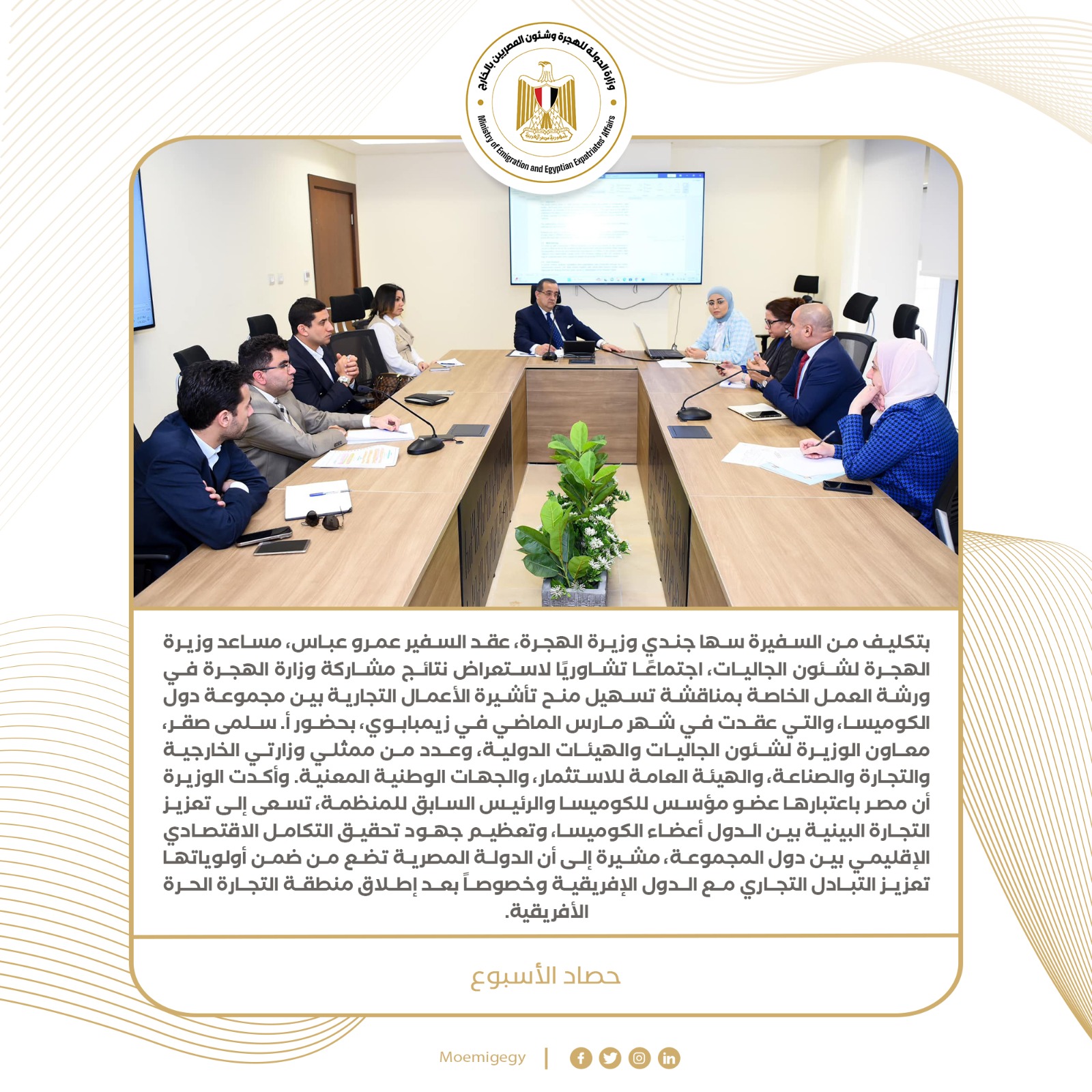 وبتكليف من السفيرة سها جندي وزيرة الهجرة، عقد السفير عمرو عباس، مساعد وزيرة الهجرة لشئون الجاليات، اجتماعًا تشاوريًّا لاستعراض نتائج مشاركة وزارة الهجرة في ورشة العمل الخاصة بمناقشة تسهيل منح تأشيرة الأعمال التجارية بين مجموعة دول الكوميسا، والتي عقدت في شهر مارس الماضي في زيمبابوي، بحضور سلمى صقر، معاون الوزيرة لشئون الجاليات والهيئات الدولية، وعدد من ممثلي وزارتي الخارجية والتجارة والصناعة، والهيئة العامة للاستثمار، والجهات الوطنية المعنية. وأكدت الوزيرة أن مصر باعتبارها عضو مؤسس للكوميسا والرئيس السابق للمنظمة، تسعى إلى تعزيز التجارة البينية بين الدول أعضاء الكوميسا، وتعظيم جهود تحقيق التكامل الاقتصادي الإقليمي بين دول المجموعة، مشيرة إلى أن الدولة المصرية تضع من ضمن أولوياتها تعزيز التبادل التجاري مع الدول الإفريقية وخصوصًا بعد إطلاق منطقة التجارة الحرة الأفريقية.