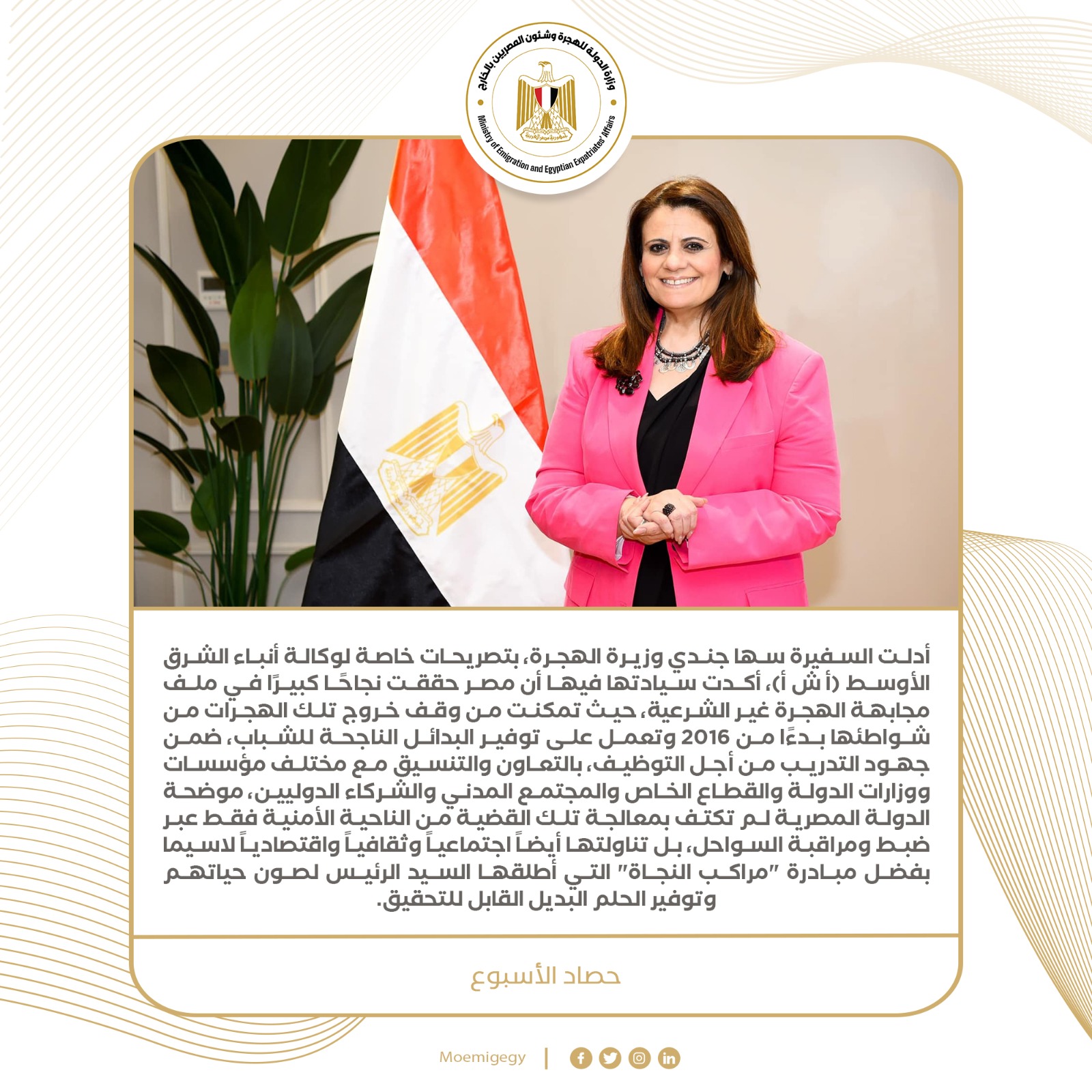 وأدلت السفيرة سها جندي وزيرة الهجرة، بتصريحات خاصة لوكالة أنباء الشرق الأوسط (أ ش أ)، أكدت سيادتها فيها أن مصر حققت نجاحًا كبيرًا في ملف مجابهة الهجرة غير الشرعية، حيث تمكنت من وقف خروج تلك الهجرات من شواطئها بدءًا من 2016 وتعمل على توفير البدائل الناجحة للشباب، ضمن جهود التدريب من أجل التوظيف، بالتعاون والتنسيق مع مختلف مؤسسات ووزارات الدولة والقطاع الخاص والمجتمع المدني والشركاء الدوليين، موضحة الدولة المصرية لم تكتف بمعالجة تلك القضية من الناحية الأمنية فقط عبر ضبط ومراقبة السواحل، بل تناولتها أيضًا اجتماعيًا وثقافيًا واقتصاديًا لاسيما بفضل مبادرة "مراكب النجاة" التي أطلقها الرئيس لصون حياتهم وتوفير الحلم البديل القابل للتحقيق.