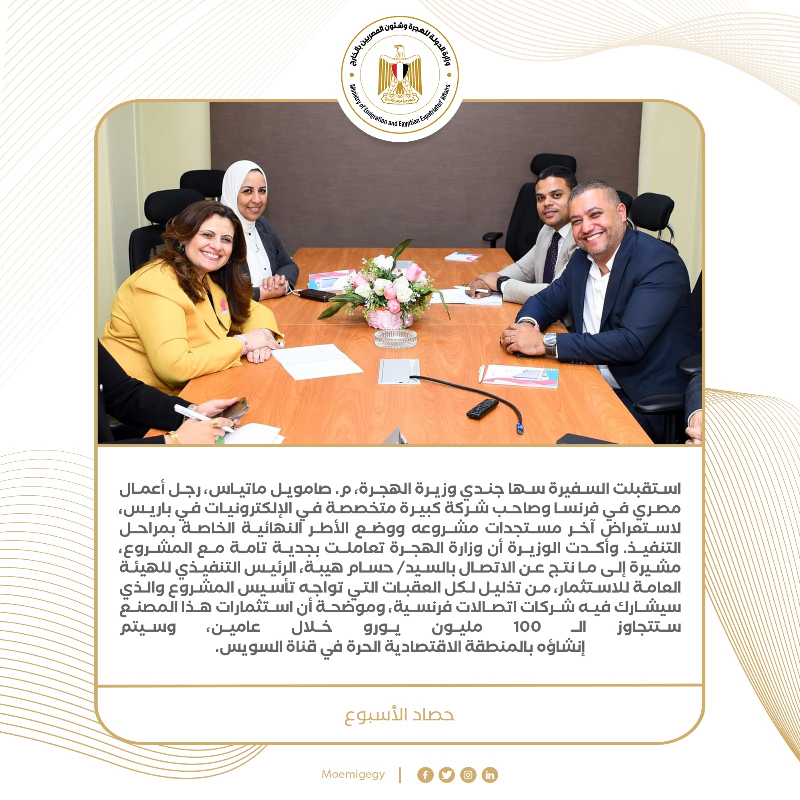 واستقبلت السفيرة سها جندي وزيرة الهجرة، م. صامويل ماتياس، رجل أعمال مصري في فرنسا وصاحب شركة كبيرة متخصصة في الإلكترونيات في باريس، لاستعراض آخر مستجدات مشروعه ووضع الأطر النهائية الخاصة بمراحل التنفيذ. وأكدت الوزيرة أن وزارة الهجرة تعاملت بجدية تامة مع المشروع، مشيرة إلى ما نتج عن الاتصال بحسام هيبة، الرئيس التنفيذي للهيئة العامة للاستثمار، من تذليل لكل العقبات التي تواجه تأسيس المشروع والذي سيشارك فيه شركات اتصالات فرنسية، وموضحة أن استثمارات هذا المصنع ستتجاوز الـ 100 مليون يورو خلال عامين، وسيتم إنشاؤه بالمنطقة الاقتصادية الحرة في قناة السويس.