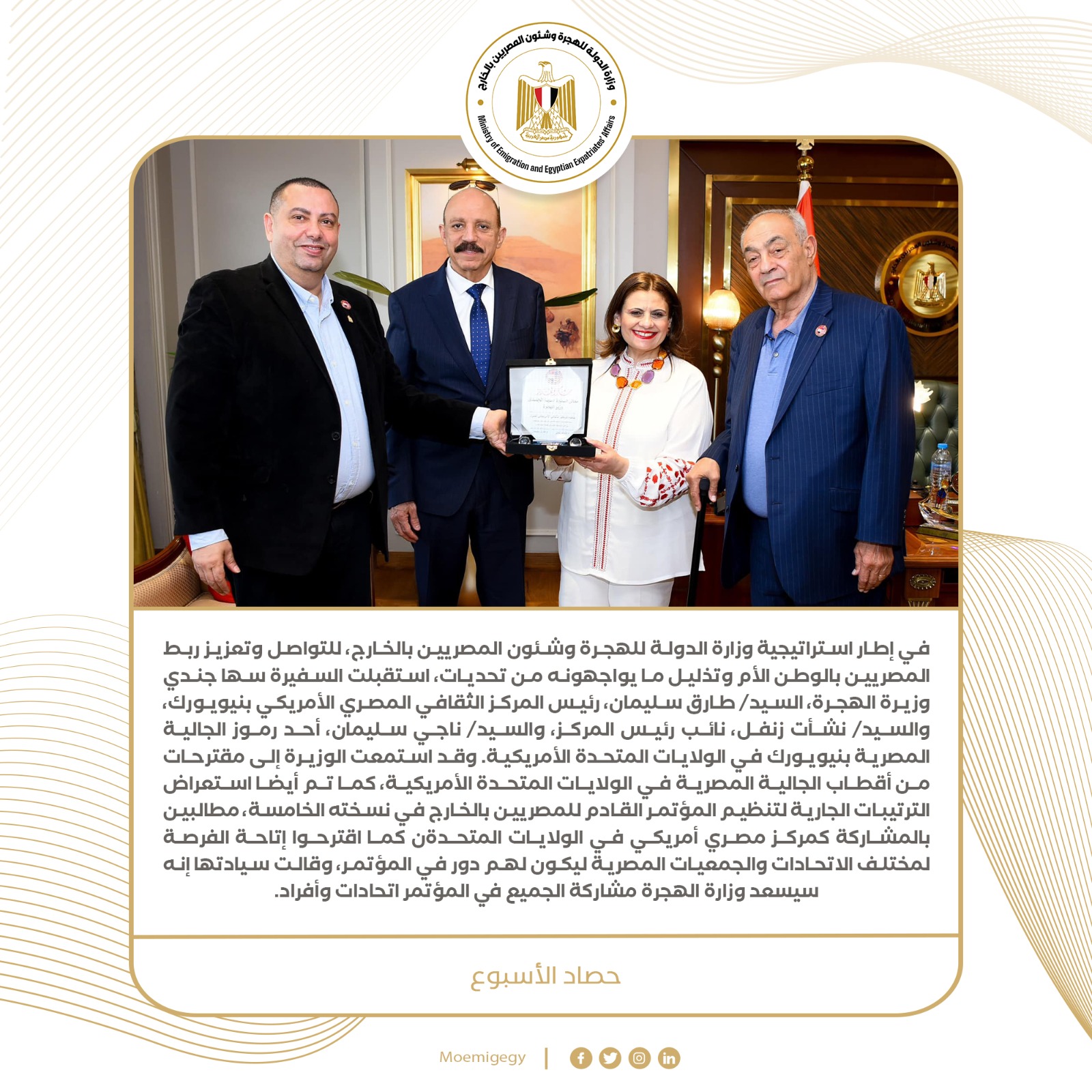 و في إطار استراتيجية وزارة الدولة للهجرة وشئون المصريين بالخارج، للتواصل وتعزيز ربط المصريين بالوطن الأم وتذليل ما يواجهونه من تحديات، استقبلت السفيرة سها جندي وزيرة الهجرة، طارق سليمان، رئيس المركز الثقافي المصري الأمريكي بنيويورك، ونشأت زنفل، نائب رئيس المركز، وناجي سليمان، أحد رموز الجالية المصرية بنيويورك في الولايات المتحدة الأمريكية.