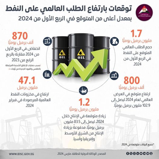كشفت الصفحة الرسمية لمركز المعلومات ودعم اتخاذ القرار بمجلس الوزراء على موقع التواصل الاجتماعي "فيسبوك" عن ارتفاع الطلب العالمي على النفط خلال 2024.