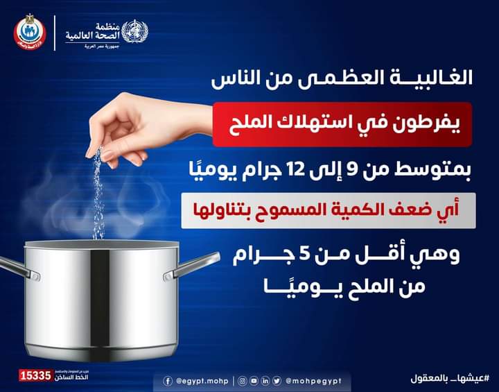 ونصحت وزارة الصحة بالالتزام بأقل من ٥ جرامات يوميًا للحماية من ارتفاع ضغط الدم والأمراض الأخرى.