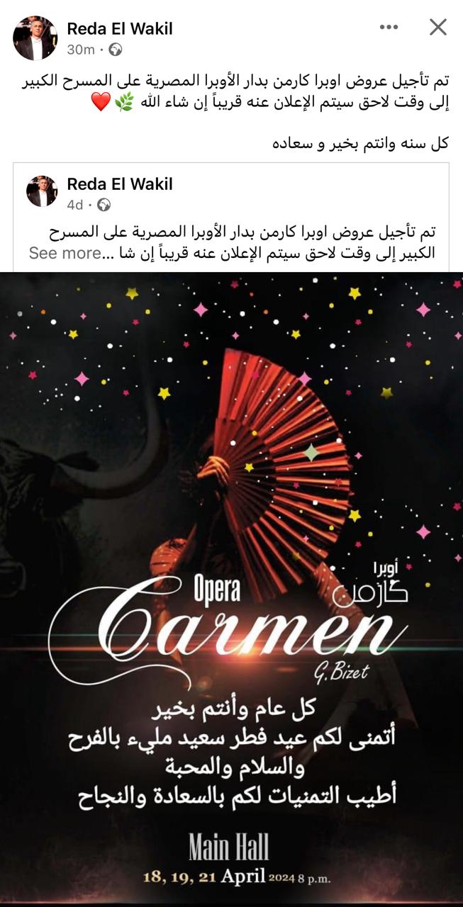 وكتب الدكتور رضا الوكيل على صفحته الشخصية قائلا: “تم تأجيل عروض أوبرا كارمن بدار الأوبرا المصرية على المسرح الكبير إلى وقت لاحق سيتم الإعلان عنه قريبا بإذن الله”.