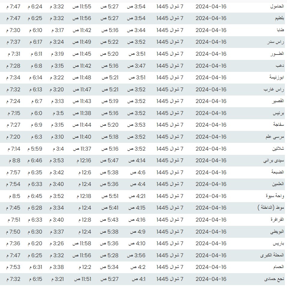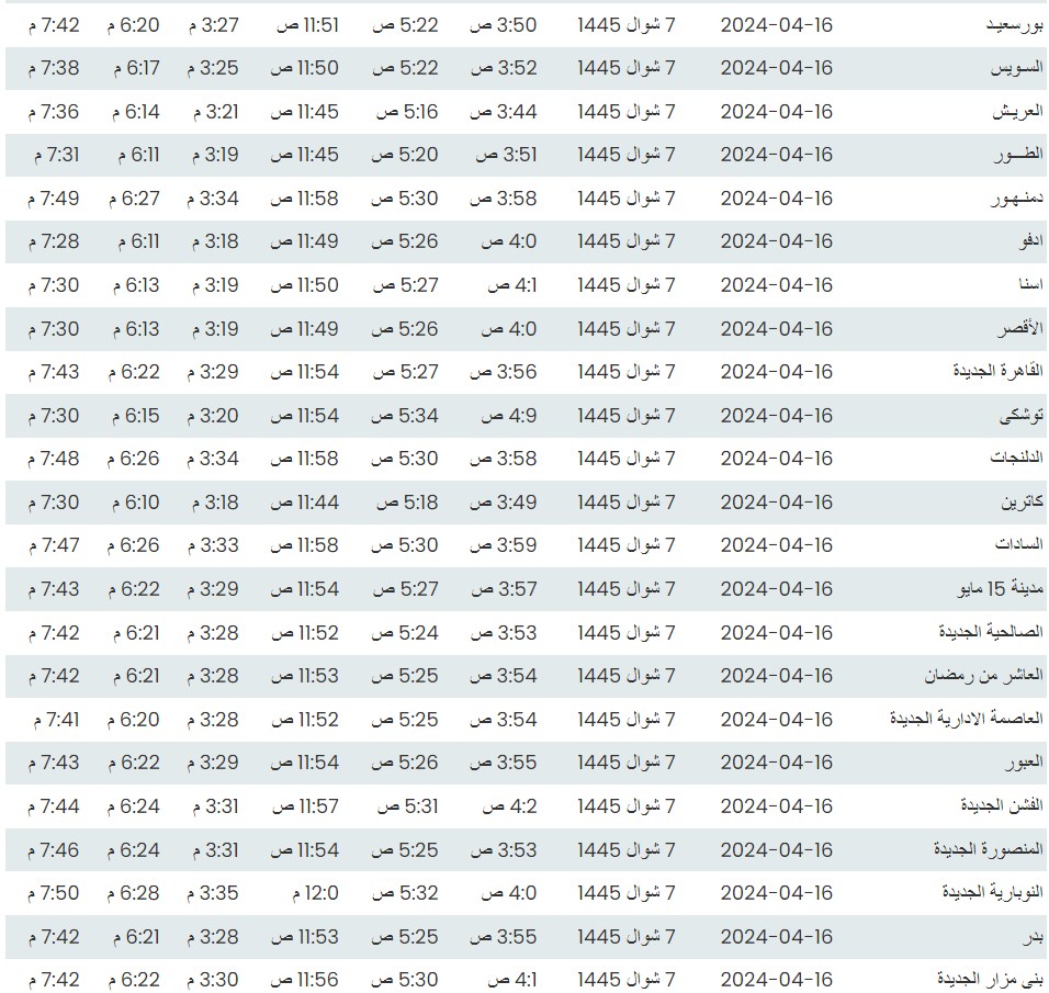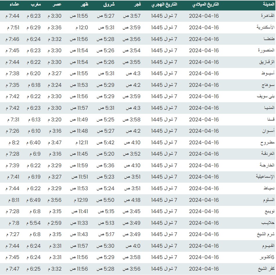 وفيما يلي مواقيت الصلاة، لعدد من مدن ومحافظات الجمهورية من واقع بيانات الهيئة العامة للمساحة