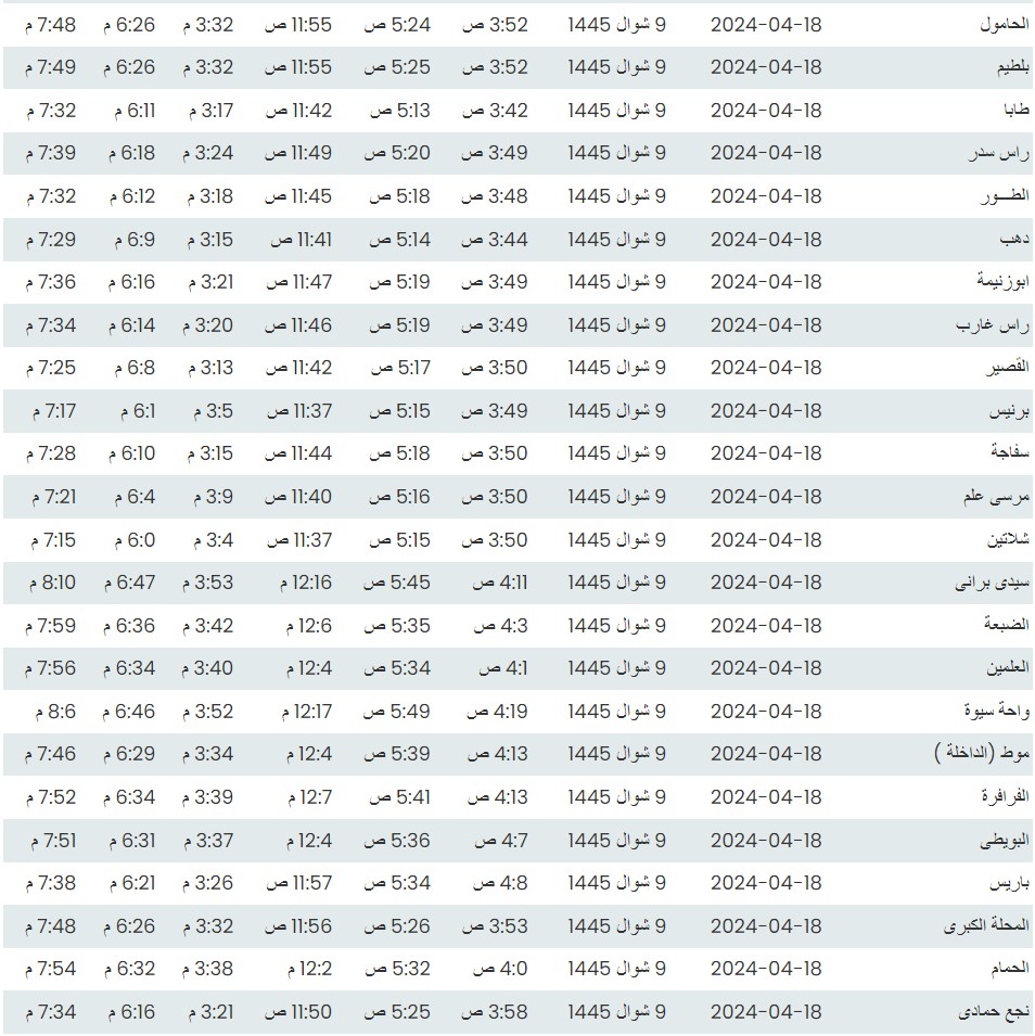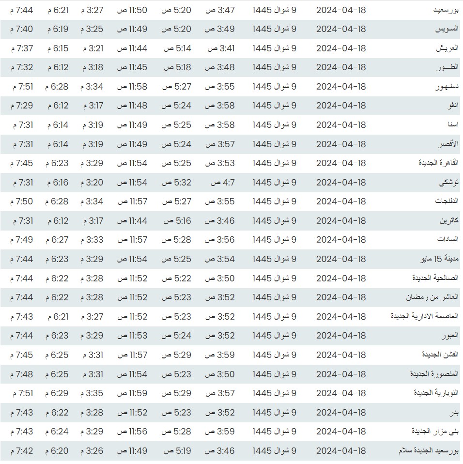 وفيما يلي مواقيت الصلاة، لعدد من مدن ومحافظات الجمهورية من واقع بيانات الهيئة العامة للمساحة
