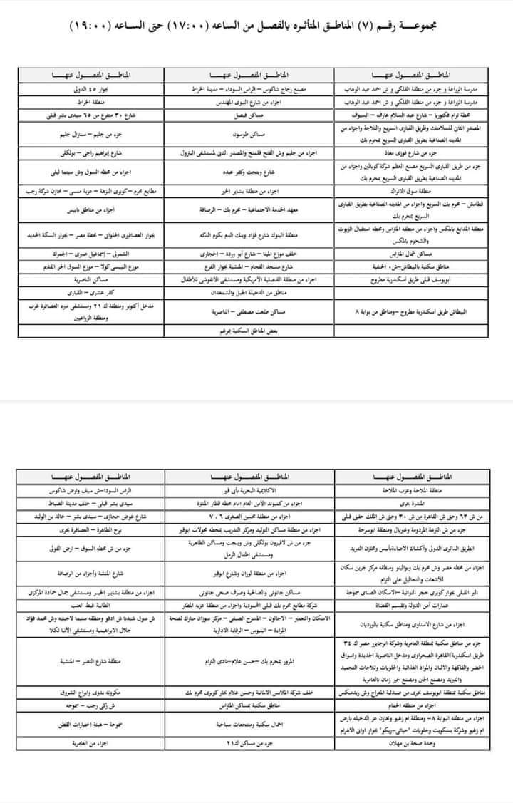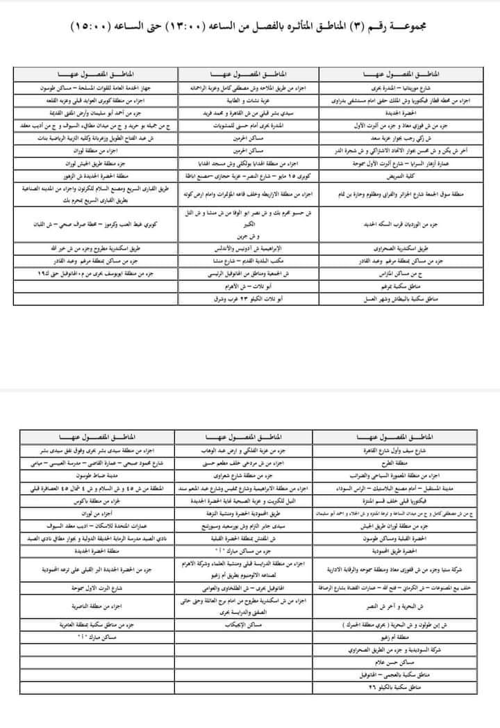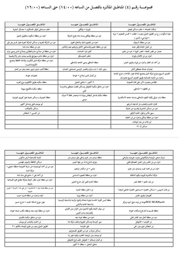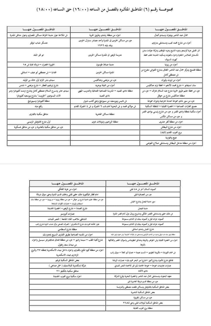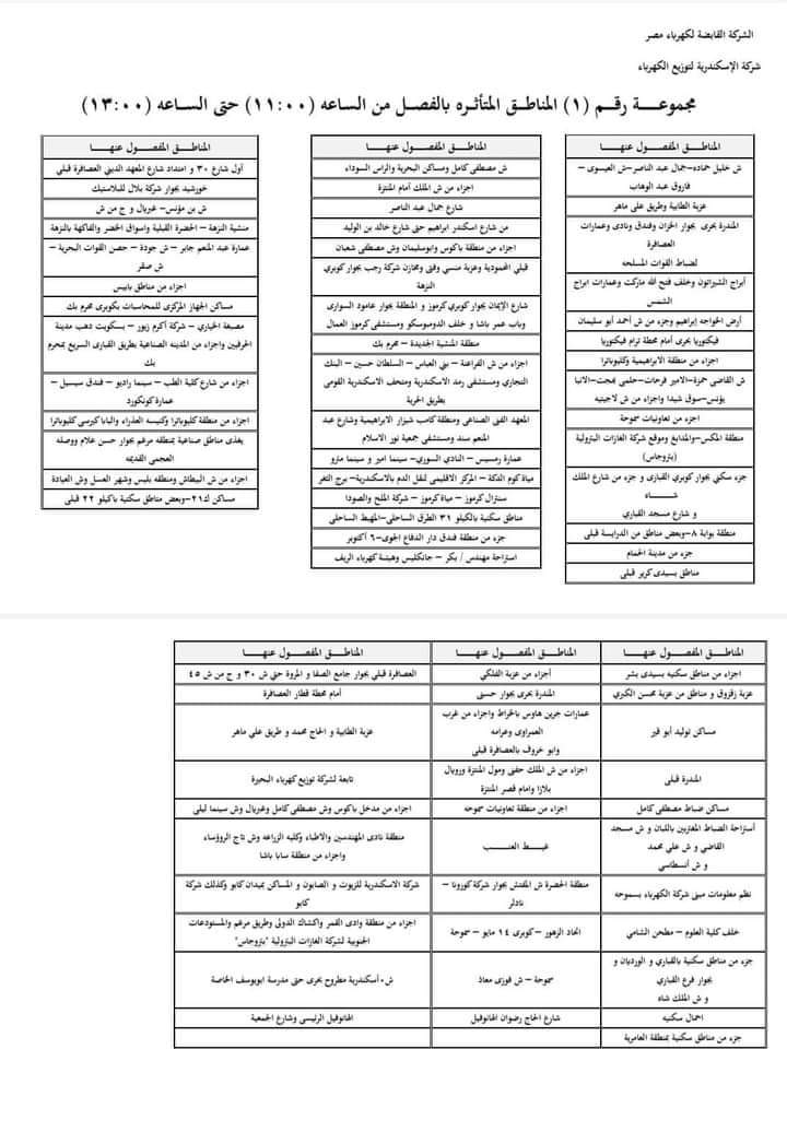 وجرى تقسيم الإسكندرية الي 11 مجموعة من شركة الكهرباء بجداول زمنية للشوارع والمناطق المختلفة بالمدينة وإعلانها حتى يجري أخذ الاحتياطات اللازمة في المنازل والمنشآت العامة والمدارس فيما يترتب علي انقطاع التيار الكهربائي عن تلك المناطق بشكل تام لمدة ساعتان كاملتين.