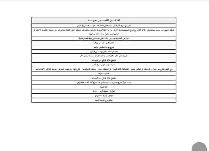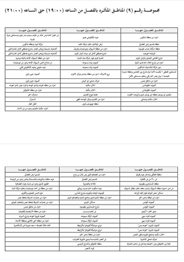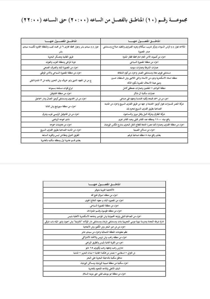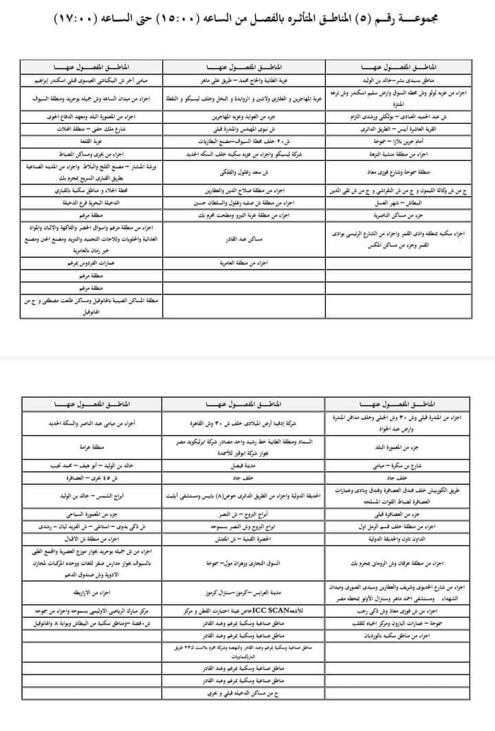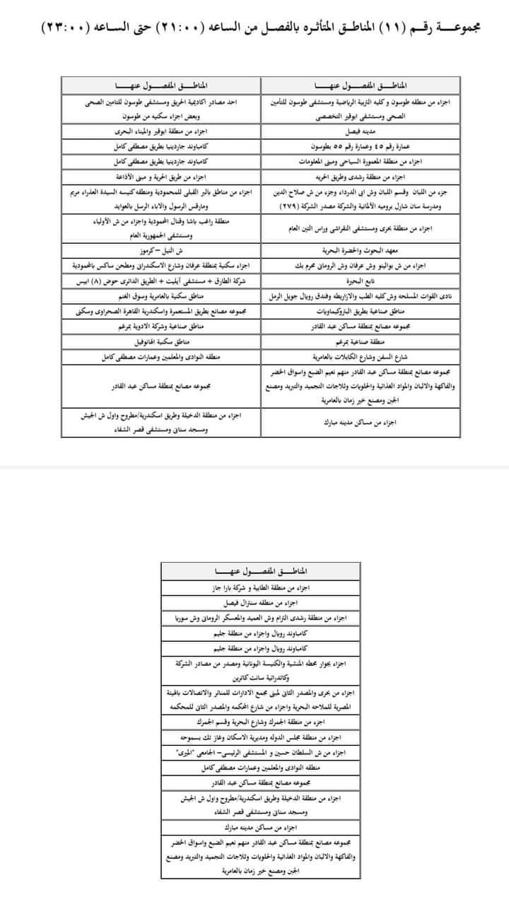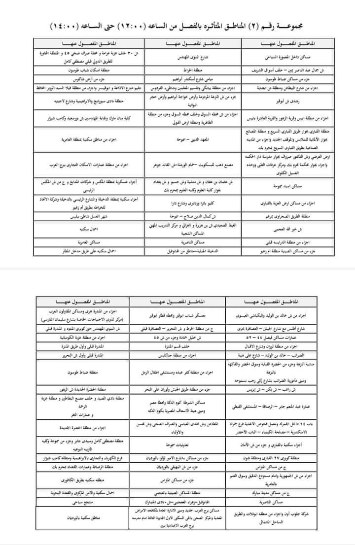 وجرى تقسيم الإسكندرية الي 11 مجموعة من شركة الكهرباء بجداول زمنية للشوارع والمناطق المختلفة بالمدينة وإعلانها حتى يجري أخذ الاحتياطات اللازمة في المنازل والمنشآت العامة والمدارس فيما يترتب علي انقطاع التيار الكهربائي عن تلك المناطق بشكل تام لمدة ساعتان كاملتين.