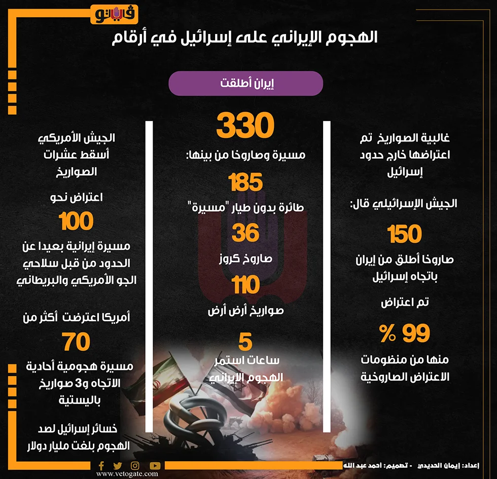 وقال الخبير الاستراتيجي محمود جمال: "استخدمت إيران في الهجوم 185 طائرة مسيرة انتحارية، 36 صاروخ كروز، 110 صواريخ باليستي، تم اعتراض غالبية الأهداف الجوية الإيرانية باستثناء بعض الصواريخ الباليستية التي سقطت في صحراء النقب، واستهدفت بعضها قواعد نيفاتيم ورامون الجوية كما أظهرت مقاطع الفيديو التي انتشرت علي وسائل التواصل الاجتماعي وأكدته وسائل إعلام إسرائيلية".