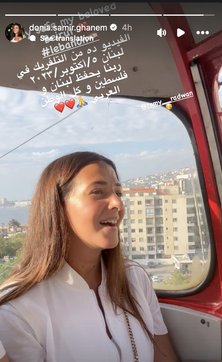 نشرت الفنانة دنيا سمير غانم عبر خاصية الإستوري على حسابها على إنستجرام مقطع لها وهي في لبنان وتغني أغنية الفنانة فيروز “آخر أيام الصيفية”، وكتبت عبر الاستوري بالإنجليزية “كوني آمنة عزيزتي بيروت”٬ وتابعت “الفيديو ده من التلفريك في لبنان ٥ أكتوبر ٢٠٢٣ ربنا يحفظ لبنان وفلسطين وكل الوطن العربي”.