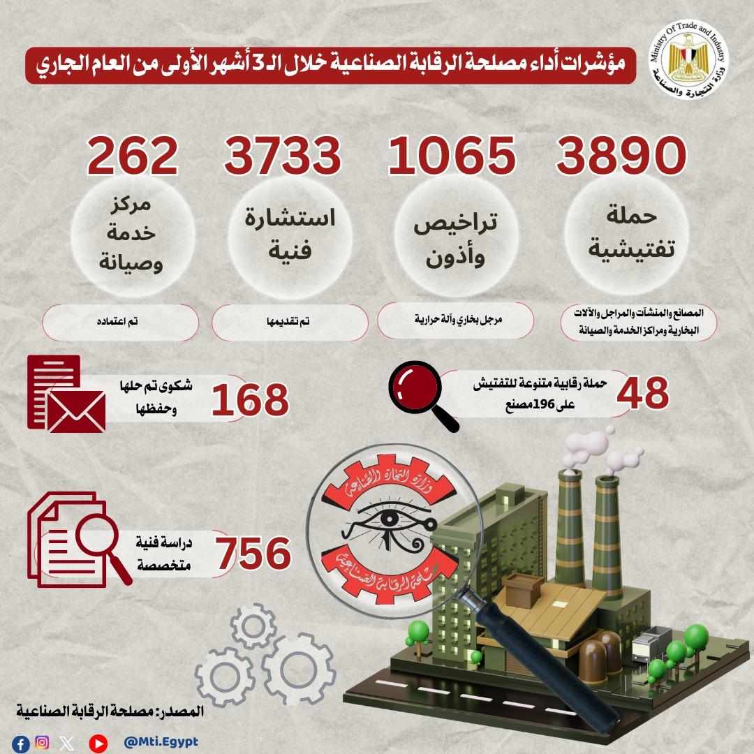 كشف أحدث تقرير تلقاه المهندس أحمد سمير وزير التجارة والصناعة حول مؤشرات أداء مصلحة الرقابة الصناعية خلال الفترة من شهر يناير وحتى شهر مارس 2024، أن المصلحة قامت بإجراء 3890 حملة تفتيشية على المصانع والمنشآت والمراجل والآلات البخارية ومراكز الخدمة والصيانة.