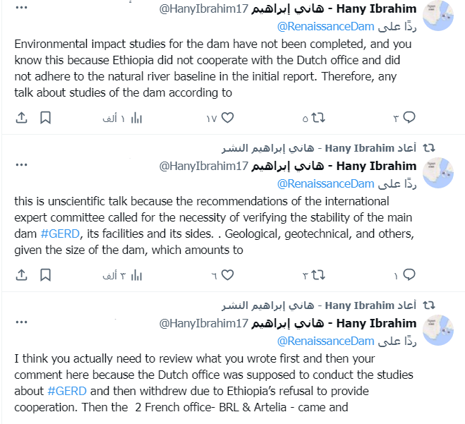 وكشف هاني إبراهيم عن زيف ادعاء استكمال دراسات سد النهضة، فقال: "أعتقد أنك فعلا بحاجة إلى مراجعة ما كتبته أولا لأنه كان من المفترض أن يقوم المكتب الهولندي بإجراء الدراسات حول سد النهضة، ثم انسحب بسبب رفض إثيوبيا تقديم التعاون. ثم جاء المكتب الفرنسي الثاني - BRL & Artelia ورفضت إثيوبيا خط الأساس للنهر الطبيعي وتوقفت الدراسات."