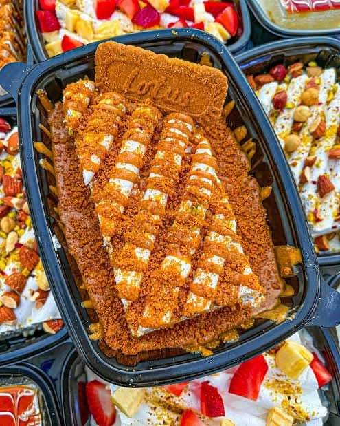 - وتدخل الثلاجة نصف ساعة قبل اضافه الصوصات المفضلة كراميل - لوتس أو فواكه الموسم وتقطع حسب الرغبه.