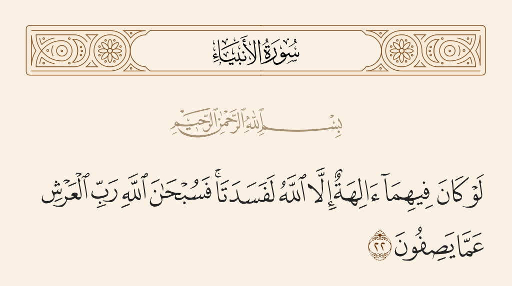 قال تعالى: «لَوْ كَانَ فِيهِمَا آلِهَةٌ إِلَّا اللَّهُ لَفَسَدَتَا فَسُبْحَانَ اللَّهِ رَبِّ الْعَرْشِ عَمَّا يَصِفُونَ».
