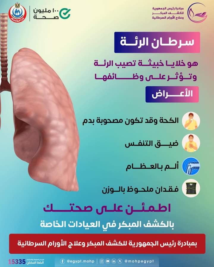 كشفت وزارة الصحة عن أهم أعراض الإصابة بسرطان الرئة والذي يعتبر من أخطر أنواع السرطان الذي يصيب الإنسان بسبب التدخين والتلوث.
