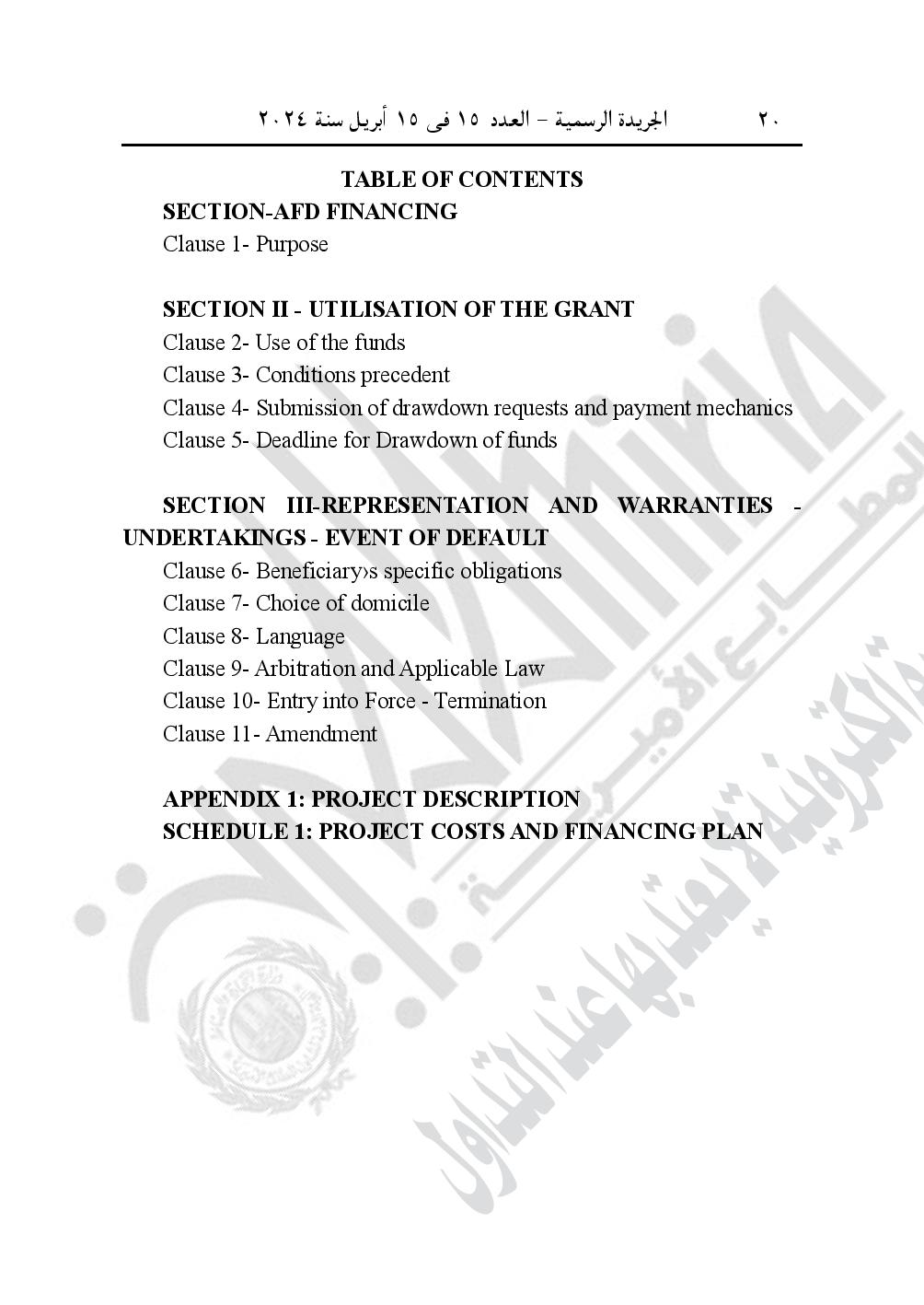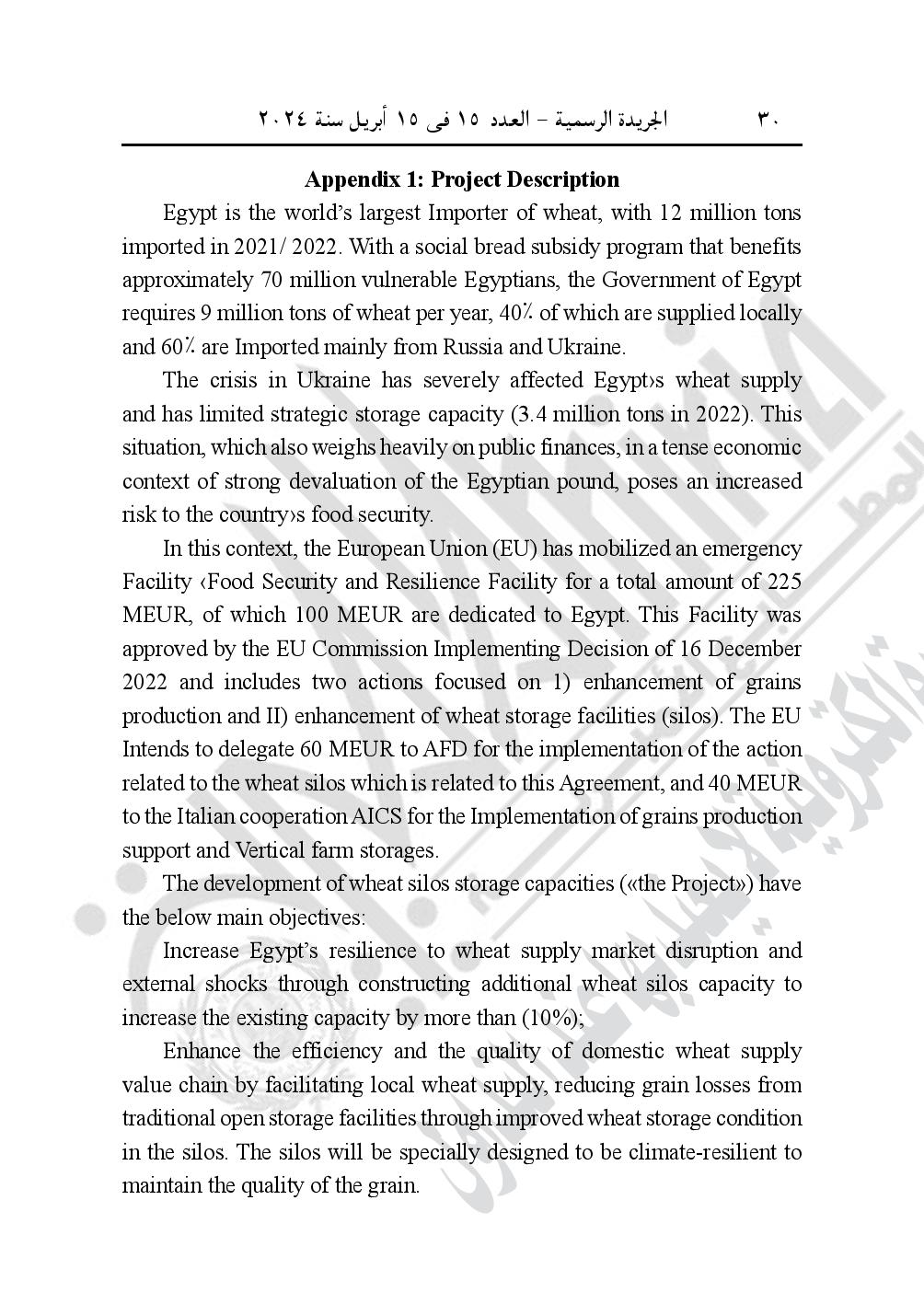 -القرار الجمهوري رقم 524 لسنة 2023، بشأن الموافقة على اتفاقية منحة بحد أقصى عالمى يبلغ ستة وخمسين مليونا وسبعمائة واثنين وأربعين ألف وثمانمائة وثمانية وخمسين يورو (56٫742٫858 يورو) لتطوير سعات تخزين صوامع القمح من الوكالة الفرنسية للتنمية.