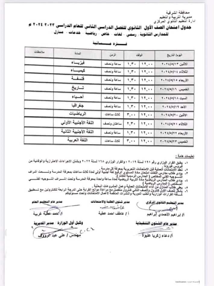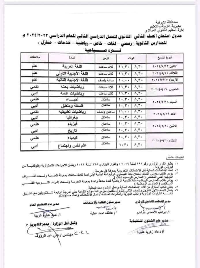 مواعيد امتحانات نهاية العام في محافظة الشرقية