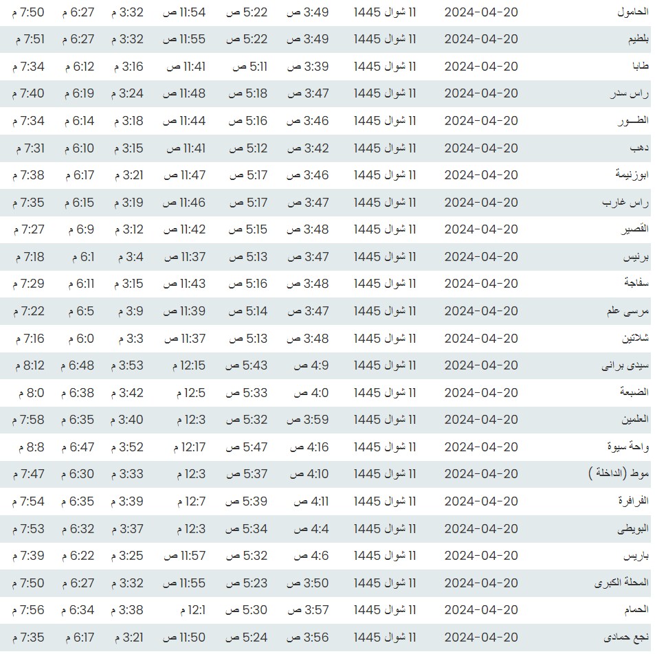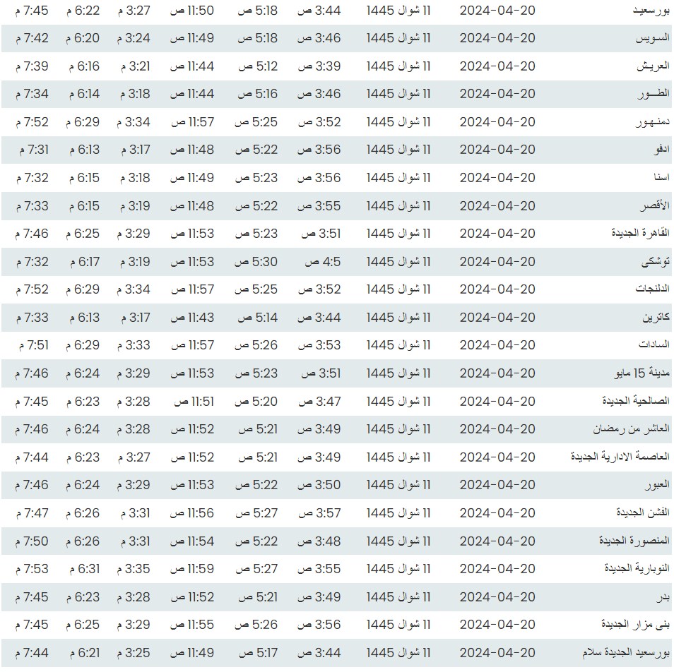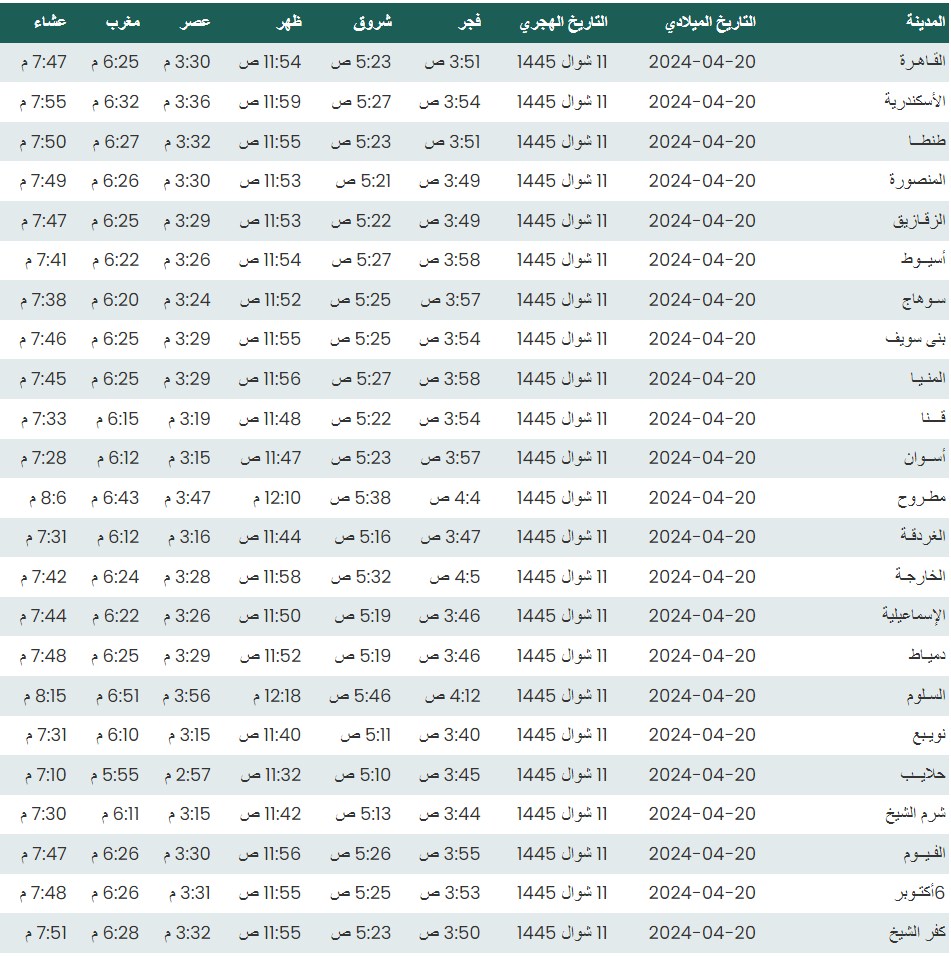 وفيما يلي مواقيت الصلاة، لعدد من مدن ومحافظات الجمهورية من واقع بيانات الهيئة العامة للمساحة