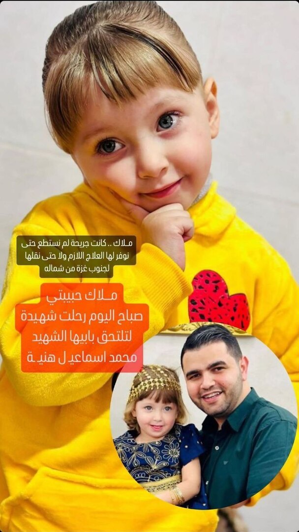 استشهدت الطفلة ملاك محمد هنية حفيدة رئيس المكتب السياسي لحركة "حماس" إسماعيل هنية، اليوم الإثنين بعد أن أصيبت في القصف الذي أدى لاستشهاد والدها وأعمامها قبل أيام.