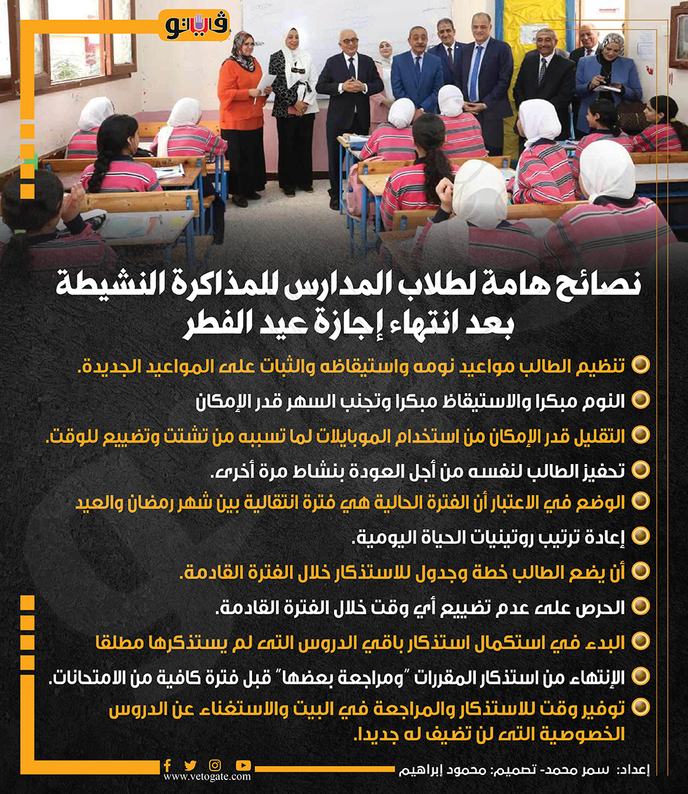 نصائح هامة لطلاب المدارس للمذاكرة النشيطة بعد انتهاء إجازة عيد الفطر (انفوجراف) الإثنين 15/أبريل/2024 - 08:58 م 4/15/2024 8:58:14 PM طلاب المدارس سمر محمد شارك طباعة 18 حجم الخط شارك طباعة طلاب المدارس أجازة عيد الفطر الموبايلات