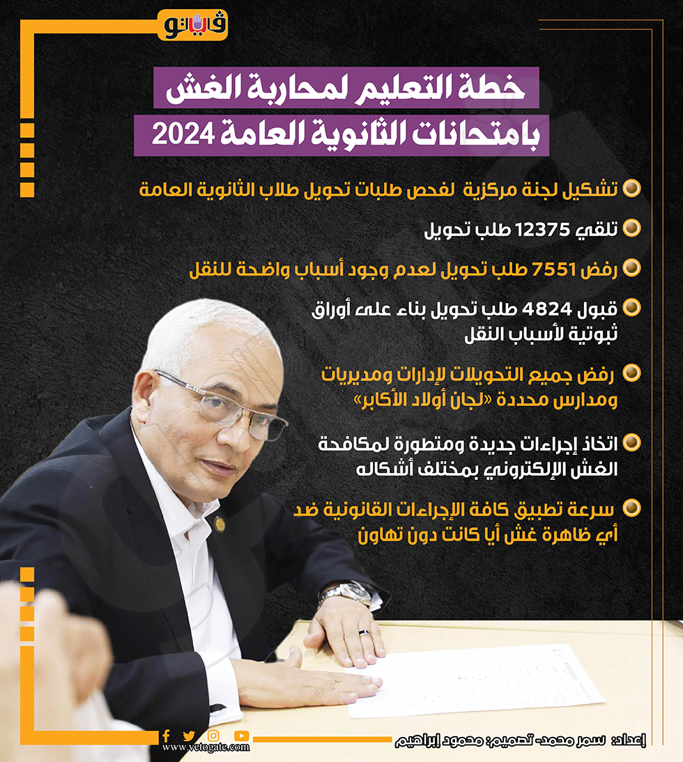 خطة التعليم لمحاربة الغش بامتحانات الثانوية العامة 2024 (إنفوجراف) الإثنين 15/أبريل/2024 - 11:00 م 4/15/2024 11:00:31 PM امتحانات الثانوية العامة 2024 سمر محمد شارك طباعة 18 حجم الخط شارك طباعة امتحانات الثانوية العامة 2024 الثانوية العامة 2024 الثانوية العامة الغش بامتحانات الثانوية العامة