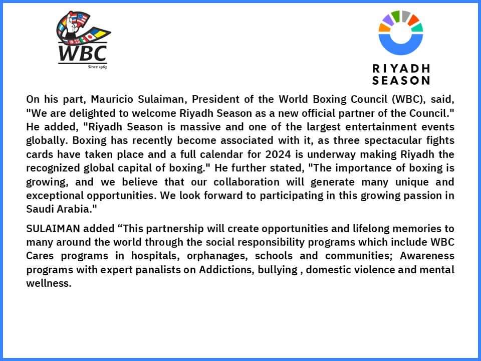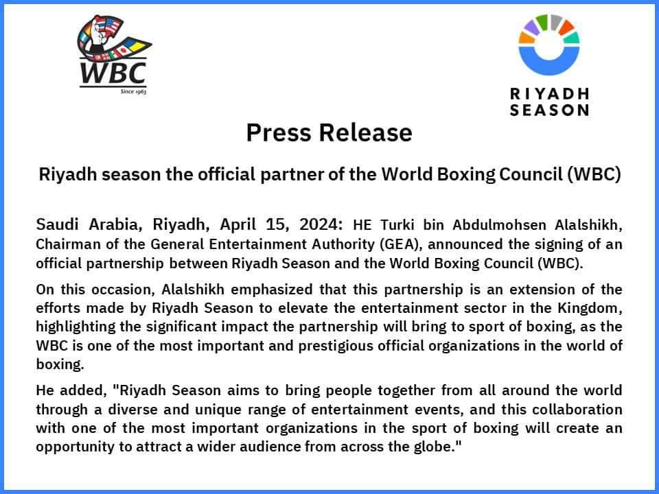 موسم الرياض، أعلن المستشار تركي آل الشيخ رئيس هيئة الترفيه بالمملكة العربية السعودية، قبل قليل، عن إبرام شراكة ثنائية بين موسم الرياض والمجلس العالمي للملاكمة (WBC).