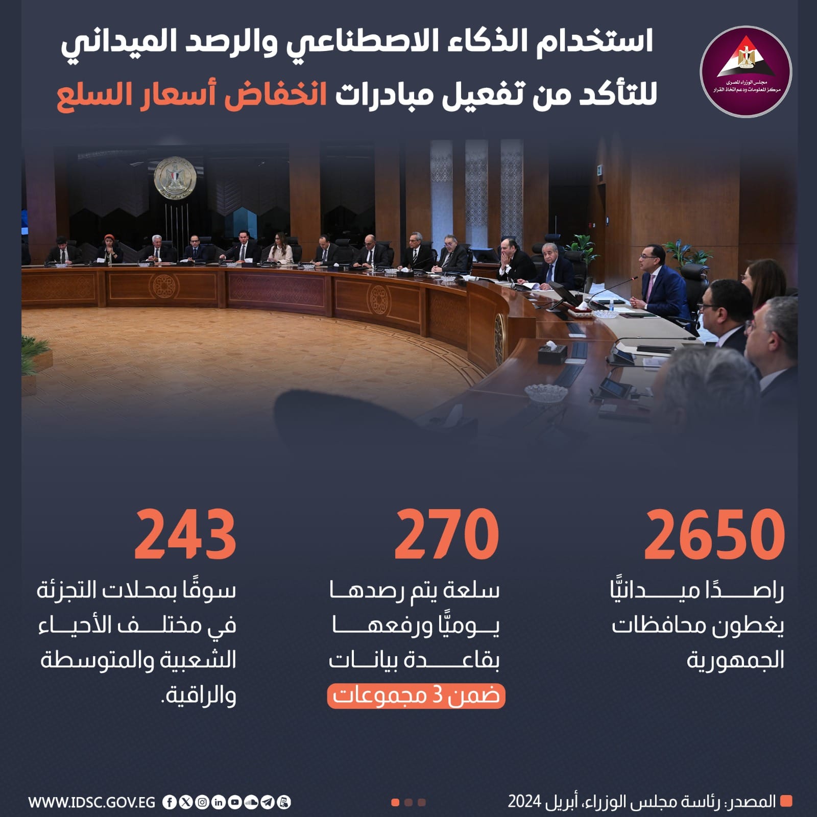 كشفت الصفحة الرسمية لمركز المعلومات ودعم اتخاذ القرار بمجلس الوزراء على موقع التواصل الاجتماعي "فيسبوك" عن استخدام الذكاء الاصطناعي والرصيد الميداني للتأكد من تفعيل مبادرة انخفاض أسعار السلع.