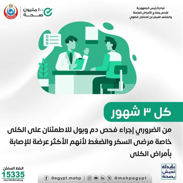 أكدت وزارة الصحة أنه الكشف المبكر والمتابعة والعلاج بالمجان ضمن مبادرة رئيس الجمهورية لفحص وعلاج الأمراض المزمنة والكشف المبكر عن الاعتلال الكلوي.