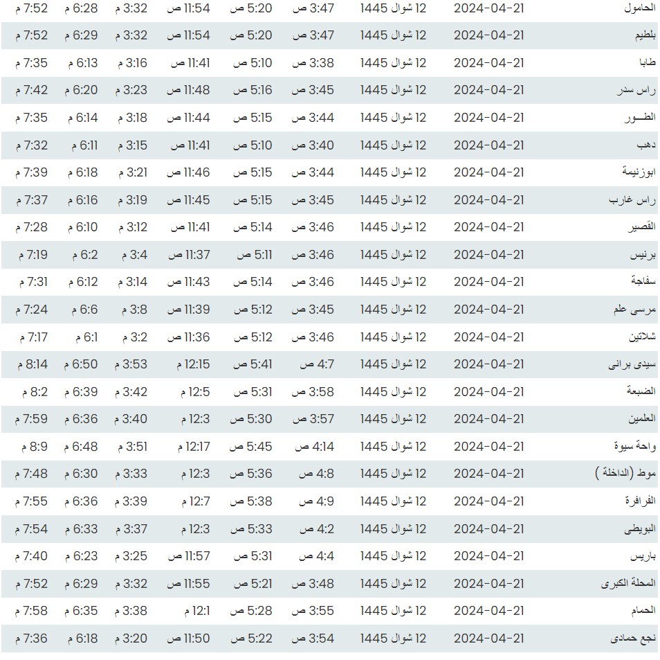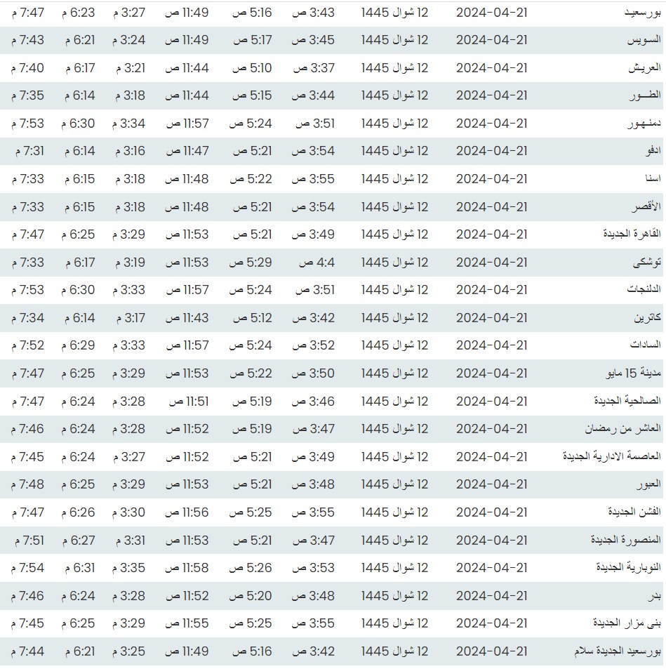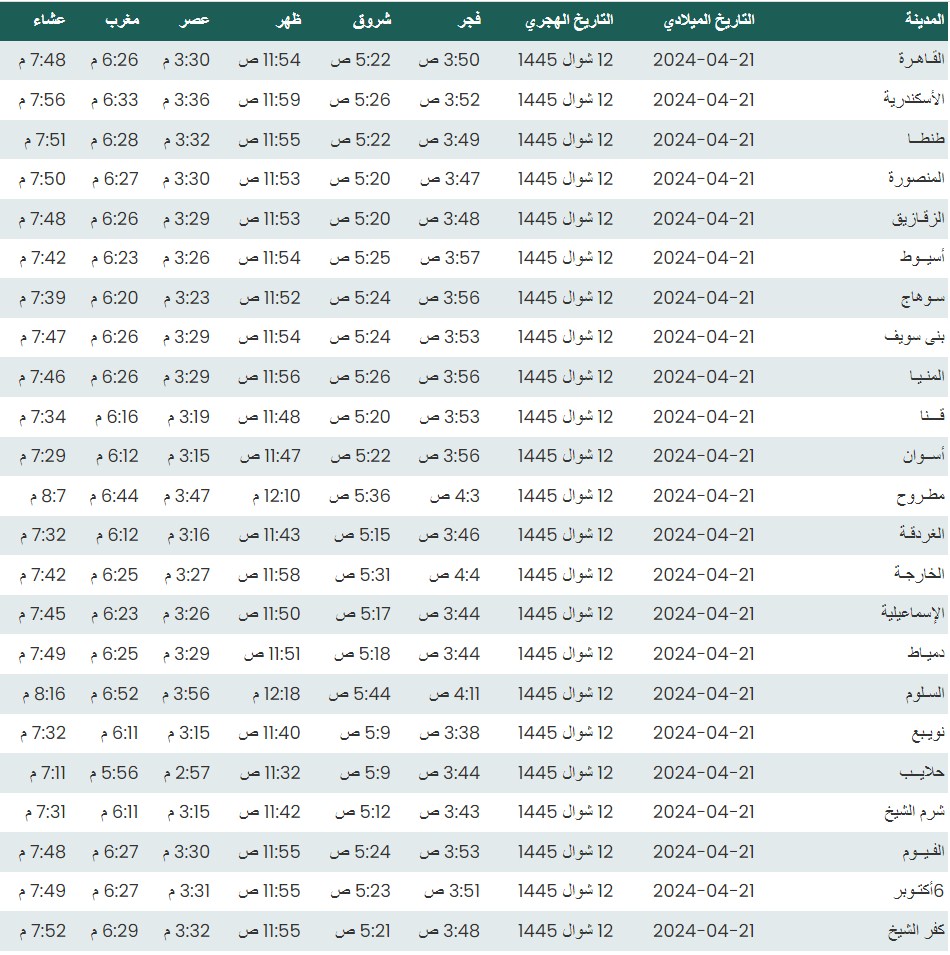 وفيما يلي مواقيت الصلاة، لعدد من مدن ومحافظات الجمهورية من واقع بيانات الهيئة العامة للمساحة