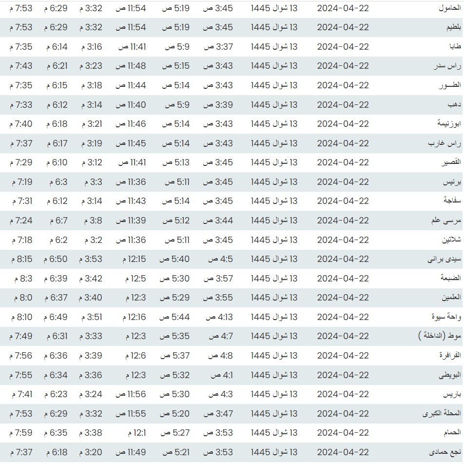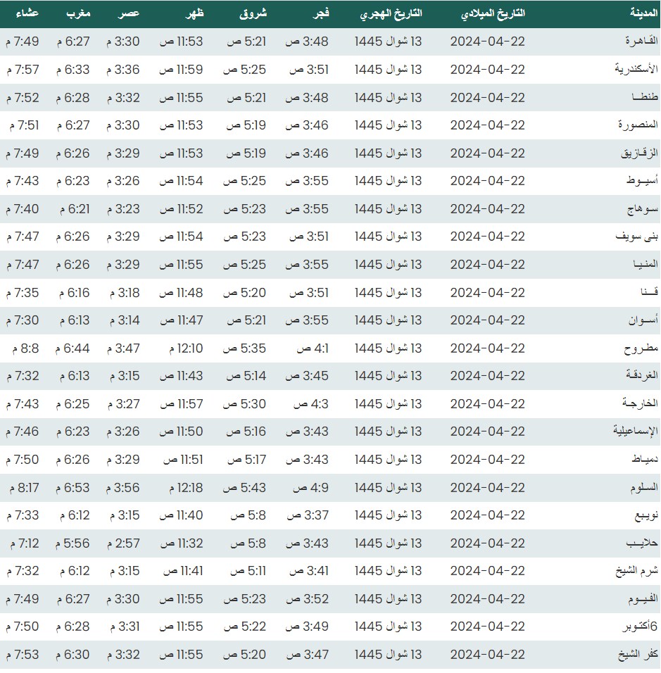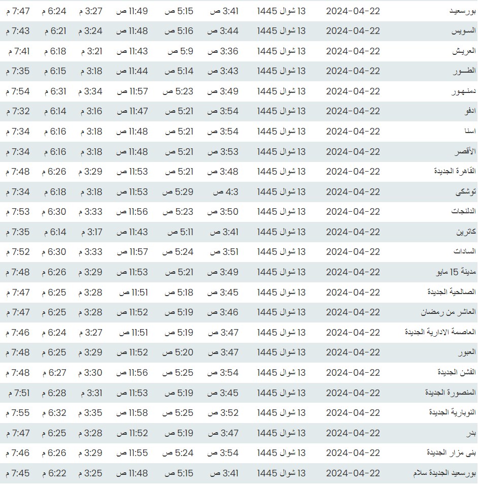 وفيما يلي مواقيت الصلاة، لعدد من مدن ومحافظات الجمهورية من واقع بيانات الهيئة العامة للمساحة