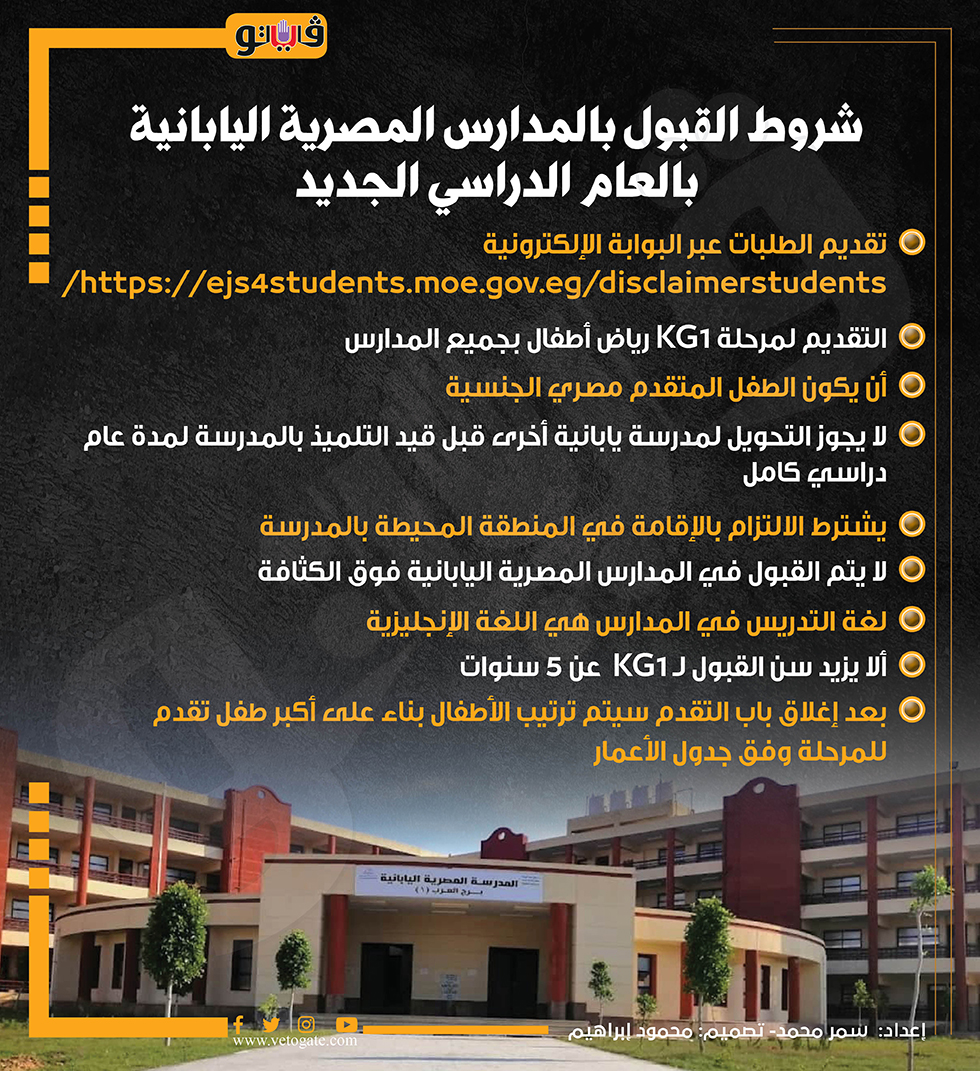 شروط القبول بالمدارس المصرية اليابانية بالعام الدراسي الجديد (إنفوجراف) الثلاثاء 16/أبريل/2024 - 05:09 م 4/16/2024 5:09:43 PM المدارس المصرية اليابانية سمر محمد شارك طباعة 18 حجم الخط شارك طباعة المدارس المصرية اليابانية العام الدراسي الجديد شروط القبول بالمدارس المصرية اليابانية رياض اطفال KG1