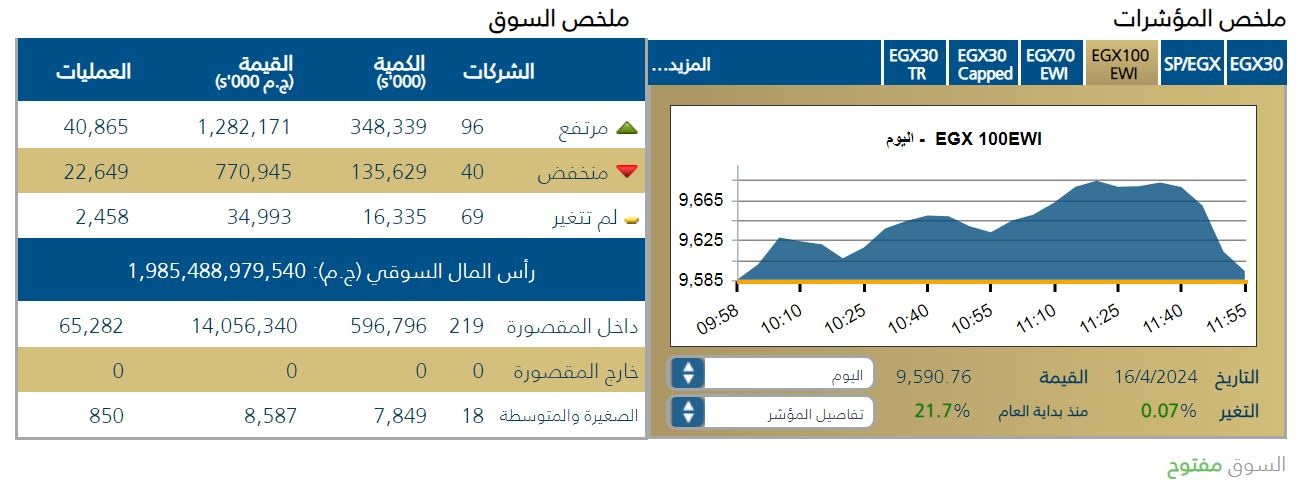- صعد مؤشر "إيجي إكس 100 متساوي الأوزان" بنسبة 0.07 % عند مستوى 9.590.76 نقطة.