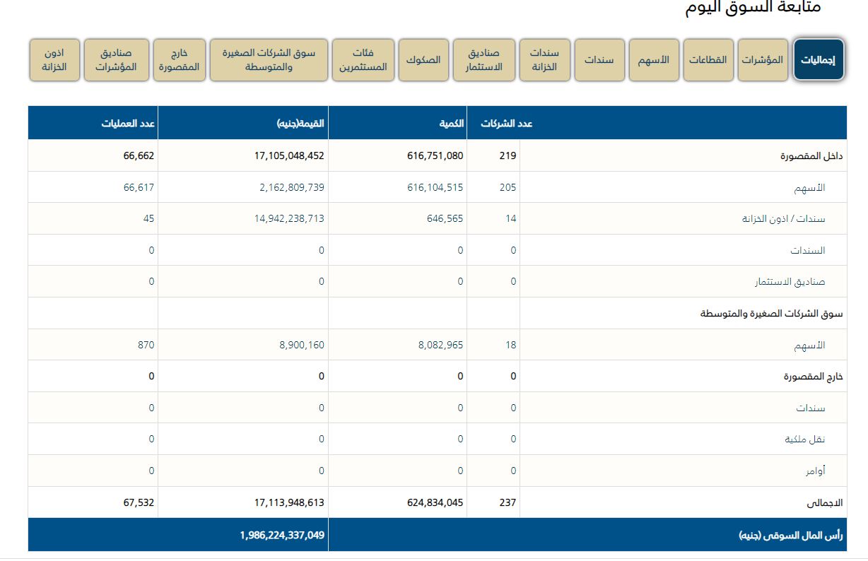 واستحوذت الأسهم على 3.72% من إجمالي قيمة التداول داخل المقصورة، في حين مثلت قيمة التداول للسندات وأذون الخزانة نحو 96.28%، وفقا للتقرير الأسبوعي للبورصة المصرية.