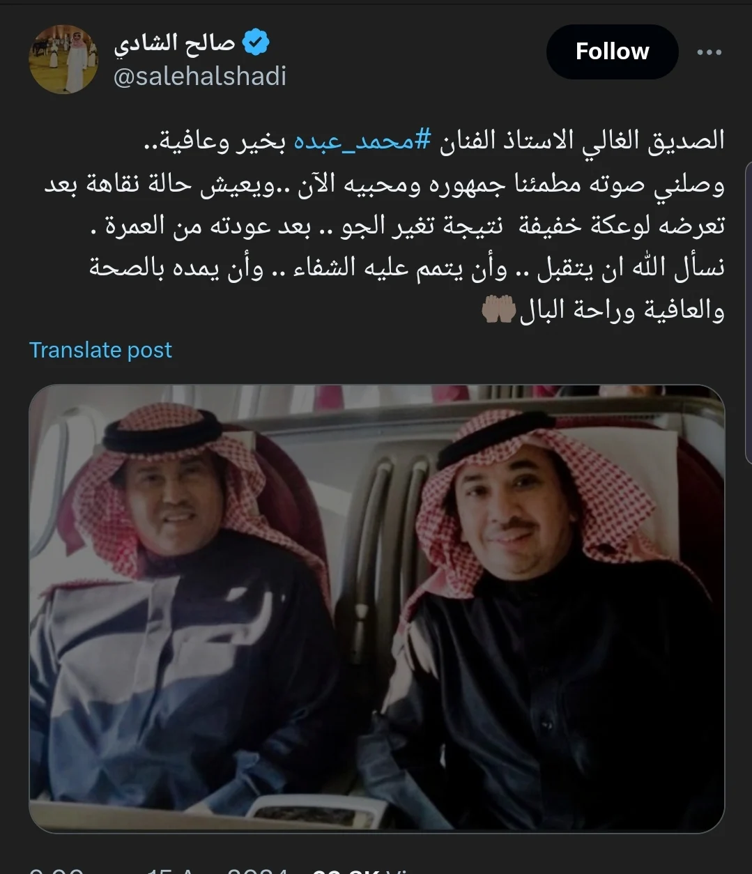 وكتب صالح الشادي من خلال حسابه الرسمي على موقع X: «الصديق الغالي الأستاذ الفنان محمد عبده بخير وعافية، وصلني صوته مطمئنا جمهوره ومحبيه الآن، ويعيش حالة نقاهة بعد تعرضه لوعكة خفيفة نتيجة تغير الجو، بعد عودته من العمرة».