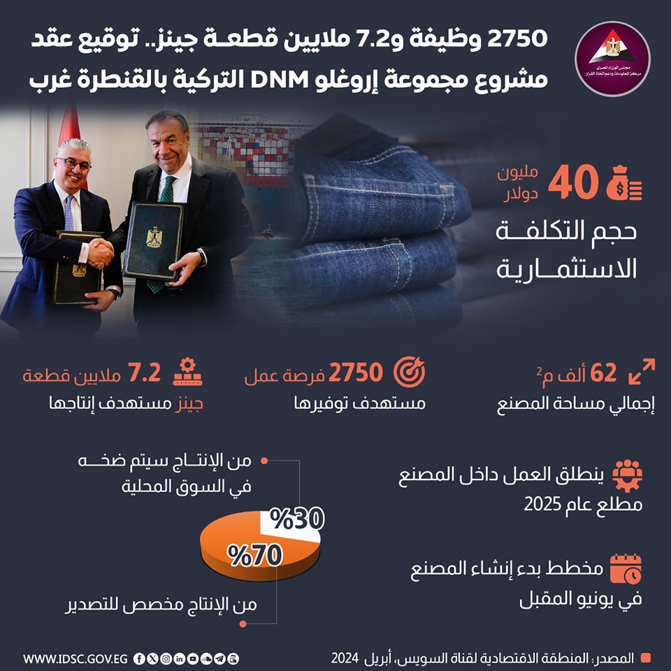 ووقعت الهيئة العامة للمنطقة الاقتصادية لقناة السويس، عقد مشروع مصنع إروغلو "DNM" لملابس الجينز بمنطقة القنطرة غرب الصناعية مع مجموعة إروغلو التركية القابضة، على مساحة 62 ألف متر مربع، بتكلفة استثمارية 40 مليون دولار، حيث يوفر 2750 فرصة عمل، ويستهدف إنتاج 7.2 ملايين قطعة جينز، ومخطط تصدير 70% من الإنتاج للخارج، وتخصيص 30% من الإنتاج للسوق المحلية.