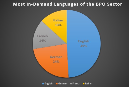 ومن ناحية أخرى، كشف تحليل البيانات الخاصة بالوظائف المطلوبة في مجال خدمات التعهيد عن أن اللغة الإنجليزية كانت الأكثر طلبًا في مراكز الاتصال وخدمات الأعمال الدولية، حيث تخطت نسبة الوظائف التي تتطلب إتقان اللغة الإنجليزية حاجز 49%، تلتها الوظائف باللغة الألمانية بـنسبة 23%، ثم اللغة الفرنسية بـنسبة 14%، وأخيرًا اللغة الإيطالية بـنسبة 13% من إجمالي الوظائف المطلوبة.