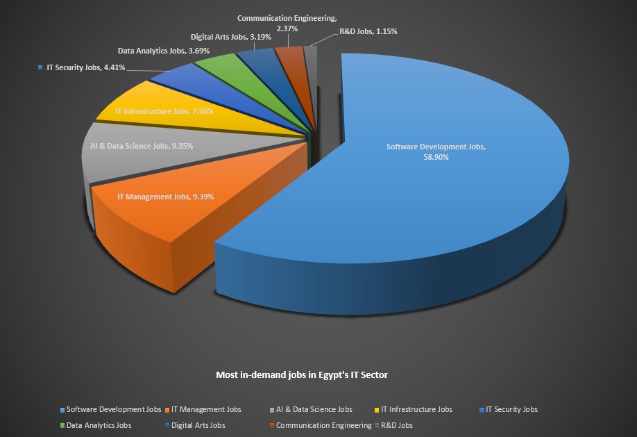 ووفقًا لتحليل بيانات نحو 3200 وظيفة متاحة بشركات تكنولوجيا المعلومات، تصدرت وظائف تطوير البرمجيات (على رأسها Full Stack Developers وSoftware Testers وتخصصات في مجالات الحوسبة السحابية) القائمة بنسبة تجاوزت 58%، تلتها وظائف إدارة تكنولوجيا المعلومات (أبرزها استشاري برامج SAP ومديري المشروعات) بنسبة 9%، ثم وظائف في مجالات الذكاء الاصطناعي وعلوم البيانات بنفس النسبة.