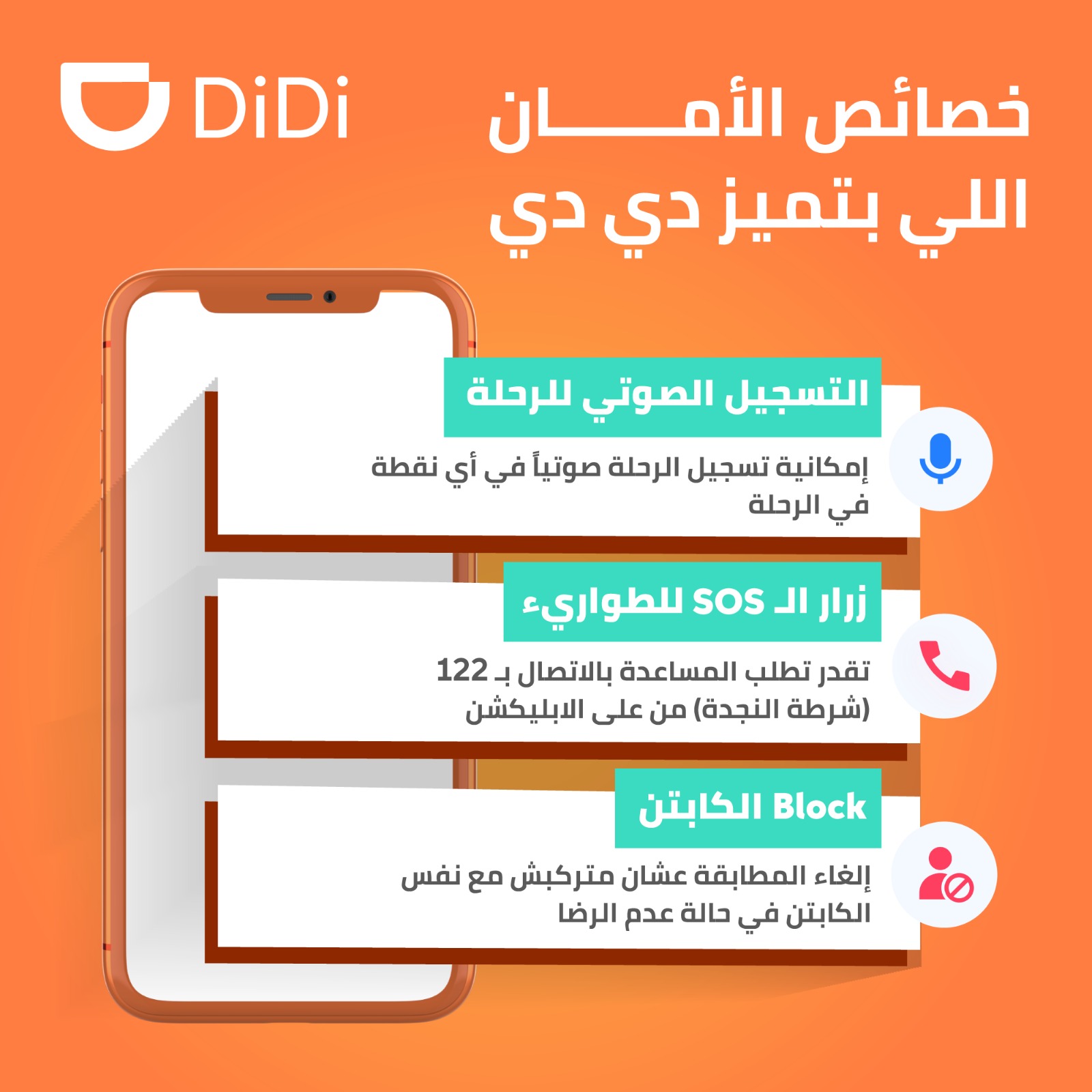 في إطار التزامها بسلامة عملائها من الركاب والسائقين، تحرص شركة دي دي مصر، الرائدة عالميًا في مجال النقل الذكي، على خلق بيئة آمنة لمنظومة عملها في مصر من خلال عدد الخصائص والامتيازات التي ينفرد بها تطبيق دي دي لضمان تطبيق أعلى معايير السلامة والأمان باعتبارها أحد أهم عوامل نجاح خدمات الشركة في السوق المصري.