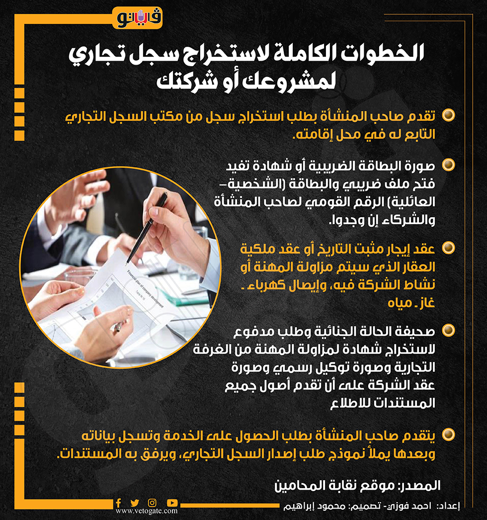 الخطوات الكاملة لاستخراج سجل تجاري لمشروعك أو شركتك (إنفوجراف) الخميس 18/أبريل/2024 - 04:03 م 4/18/2024 4:03:44 PM الخطوات الكاملة لاستخراج سجل تجاري، فيتو احمد فوزي شارك طباعة 18 حجم الخط شارك طباعة صاحب المنشأة السجل التجاري البطاقة الضريبية فتح ملف ضريبى البطاقة الشخصية