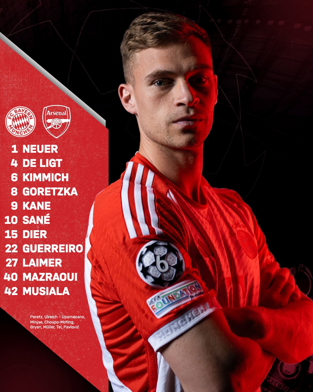 فيما يتواجد على بدلاء بايرن ميونخ أمام آرسنال في دوري أبطال أوروبا كلا من بيرتيز، أولريخ، أوباميكانو، كيم مين جاي، شوبو موتينج، مارتينيز، مولر، بالوفيتش، ماتيس تيل.
